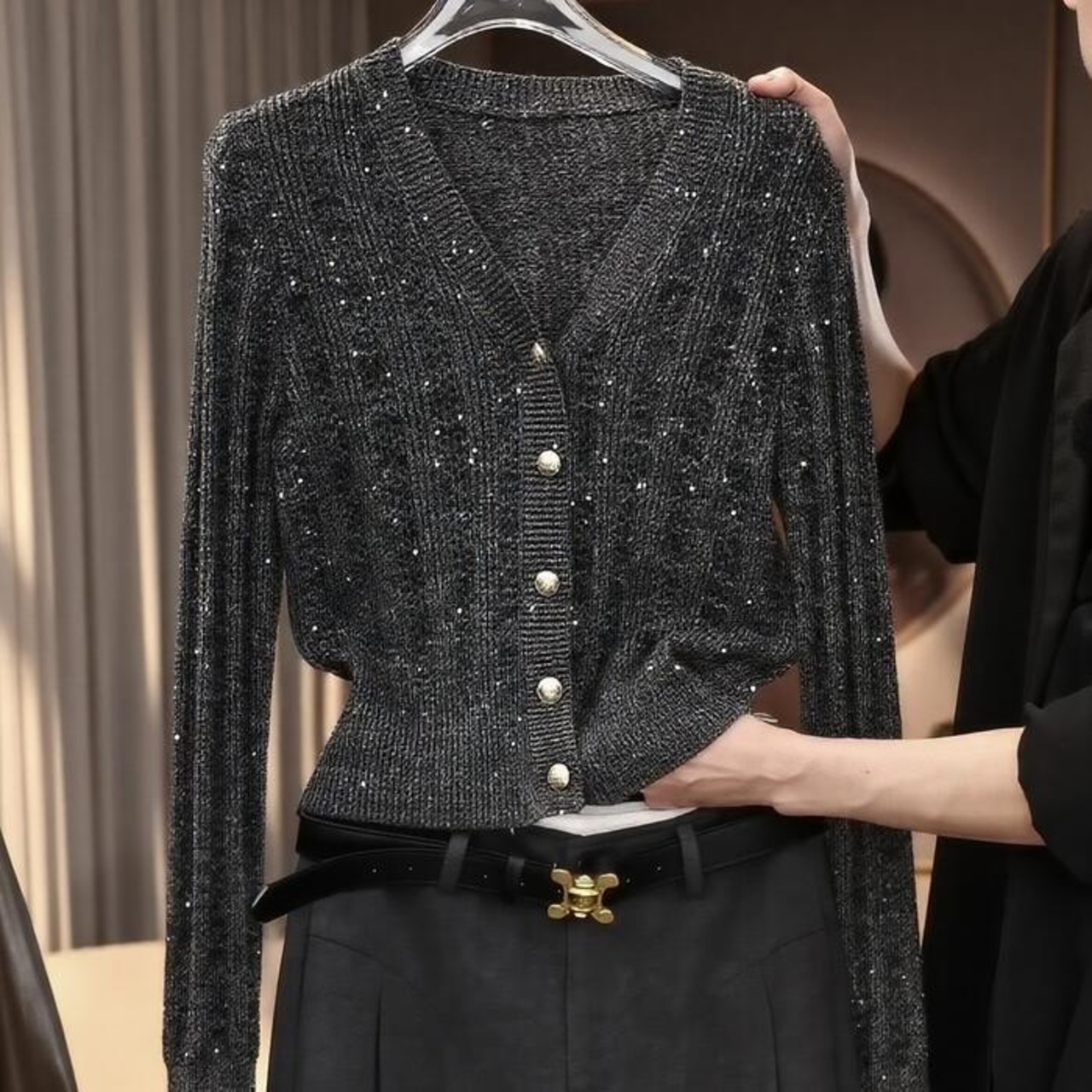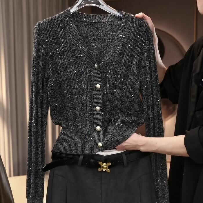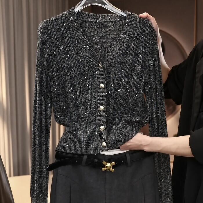細やかな編み地の中にスパンコールが織り込まれた、華やかなニットカーディガン。