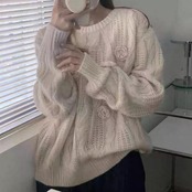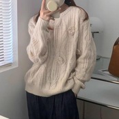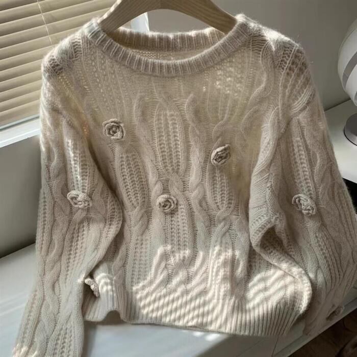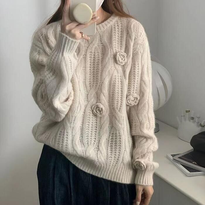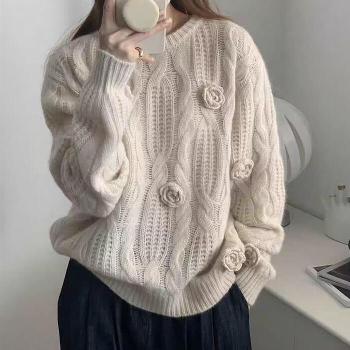 大きいサイズ 体型カバー エレガント フェミニン おしゃれ シンプル トップス ニット セーター レディース きれいめ カジュアル 大人可愛い 春 秋 冬 コサージュ 花 フラワー クルーネック ケーブル プルオーバー 長袖 ベージュ 20代 30代 40代 50代 S M L XL 2XL