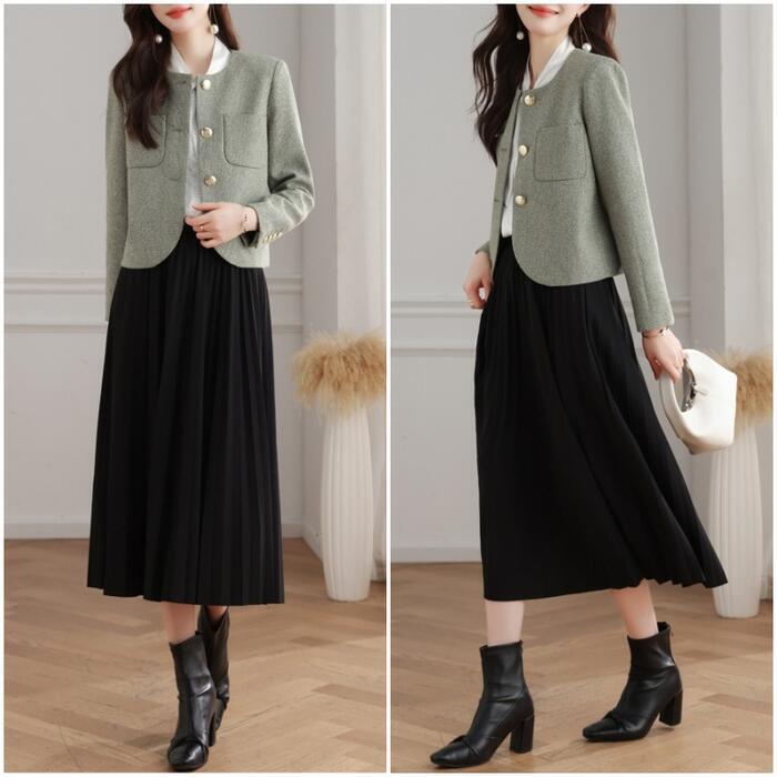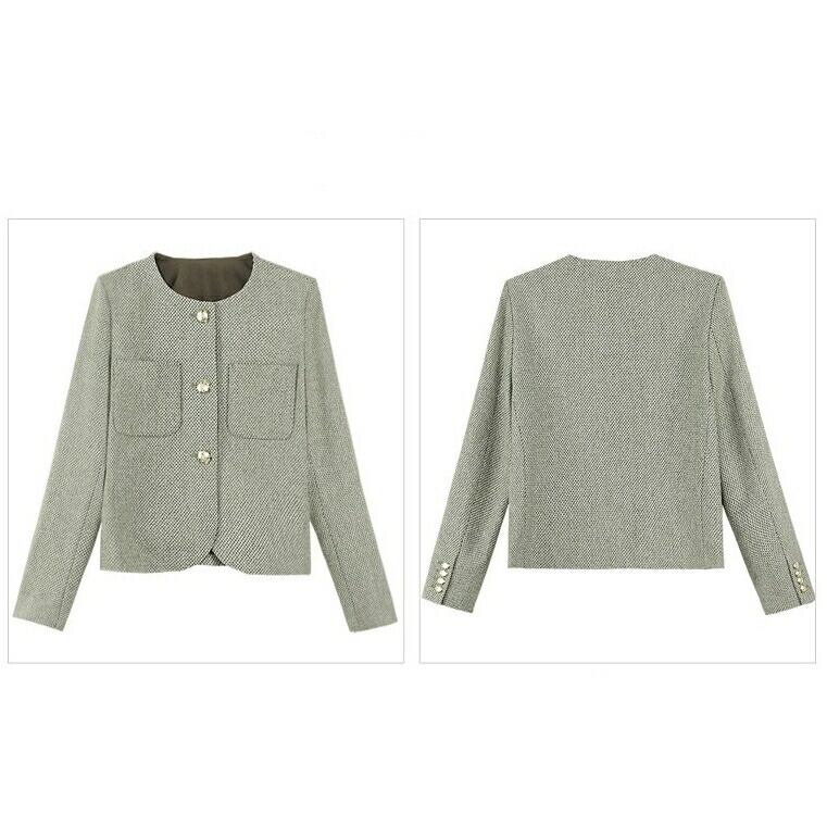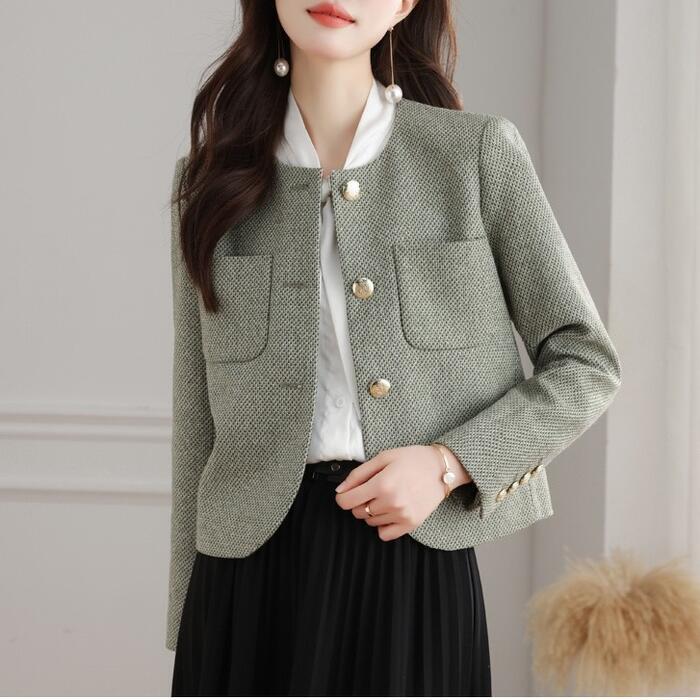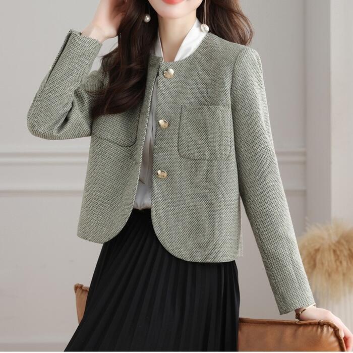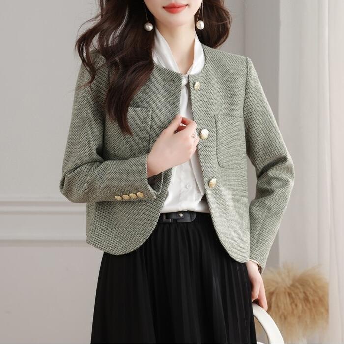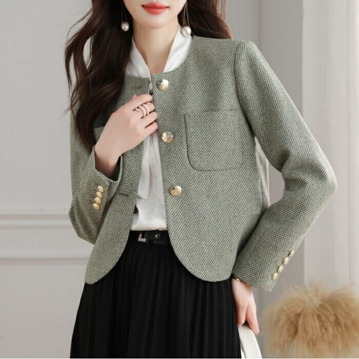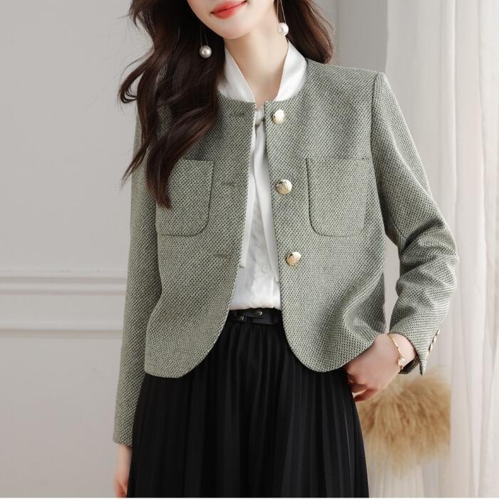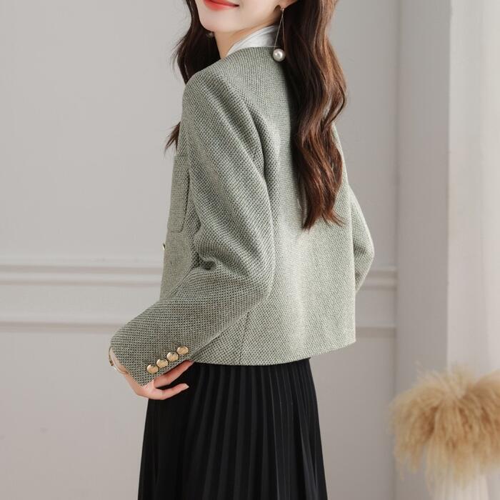大きいサイズ 体型カバー エレガント フェミニン おしゃれ 通勤 オフィス アウター コート ジャケット レディース きれいめ カジュアル 大人可愛い 春 秋 冬 ツイード調 長袖 ノーカラー ショート丈 オケージョン グリーン 緑 20代 30代 40代 50代 S M L XL