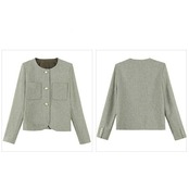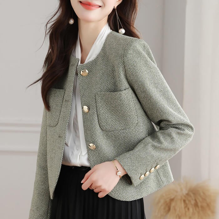 ミックスツイード風の生地が特徴の、ショート丈ノーカラージャケット。
