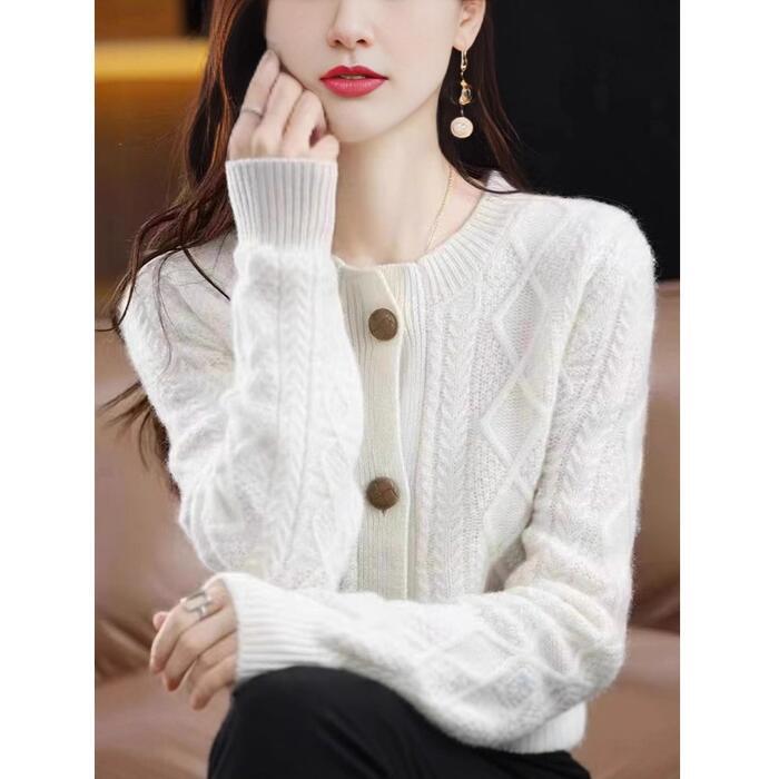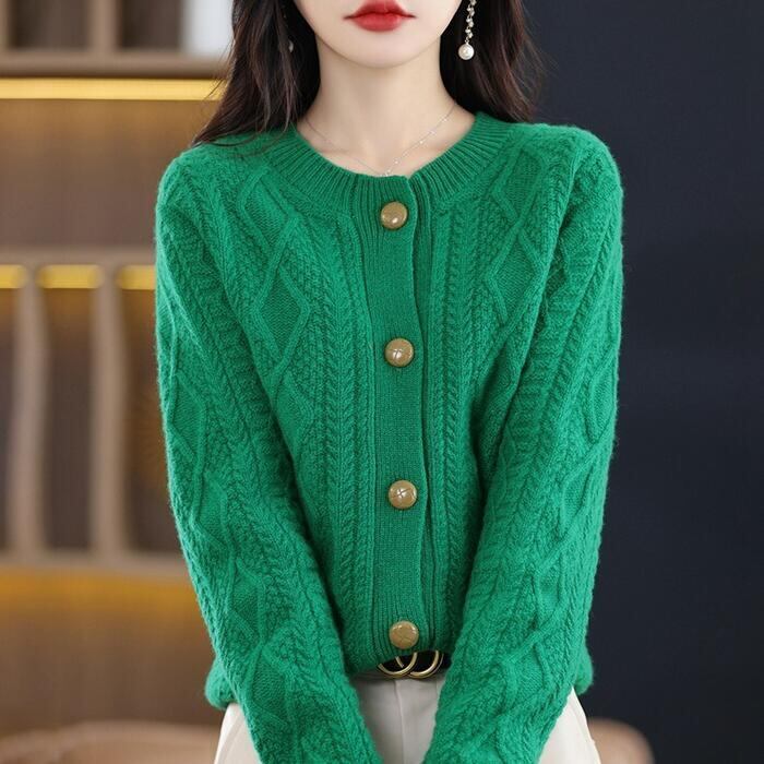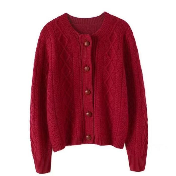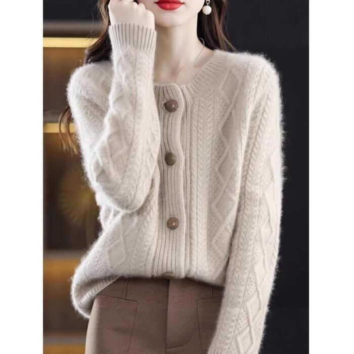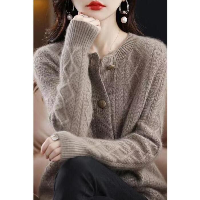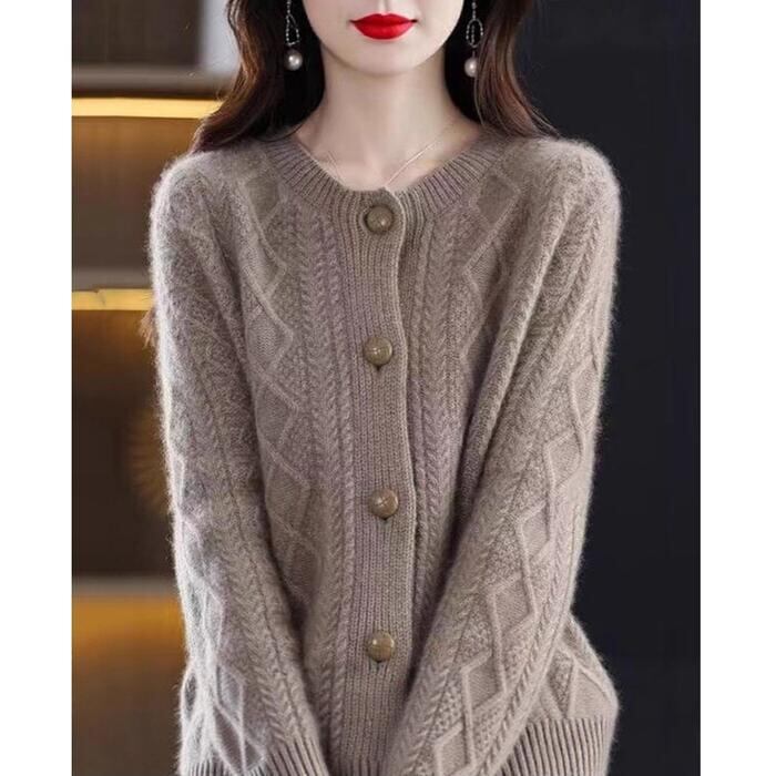 シンプルながらも表情豊かなケーブルニットカーディガンです。