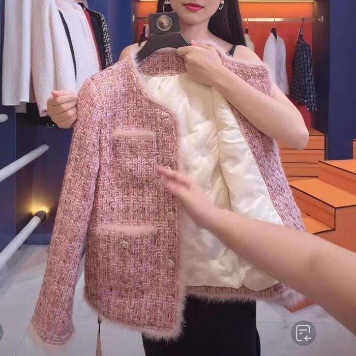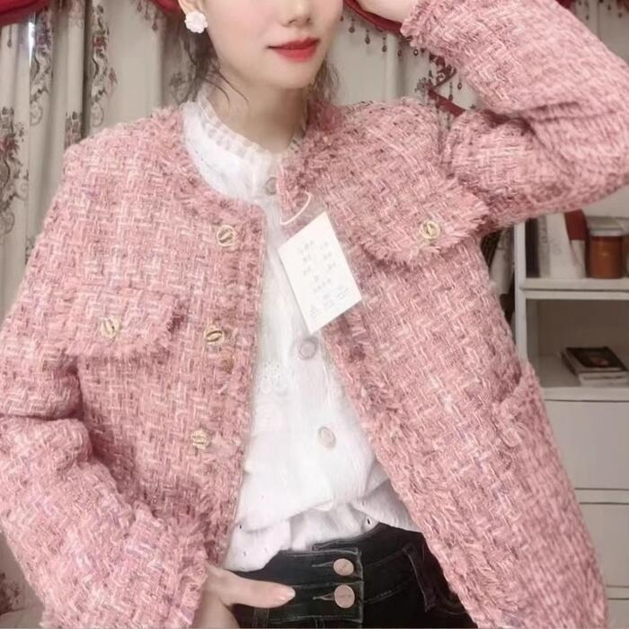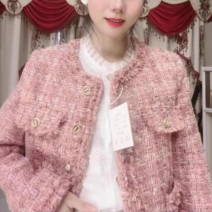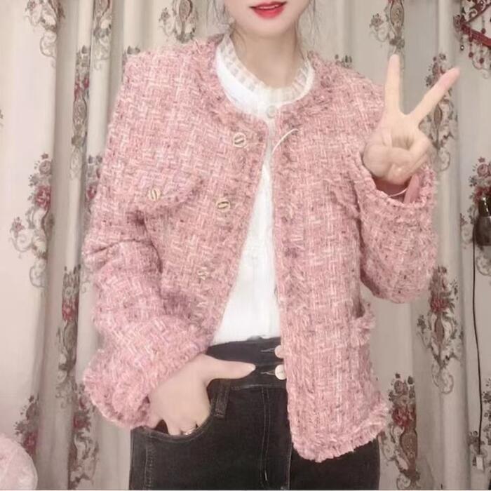 上品華やかな、優しいピンクのツイード調ジャケット。