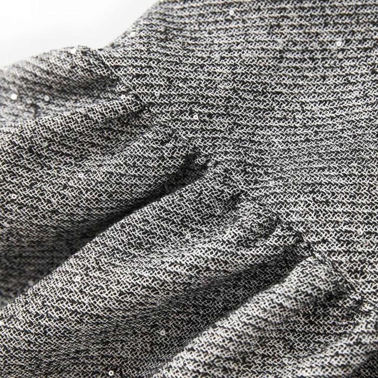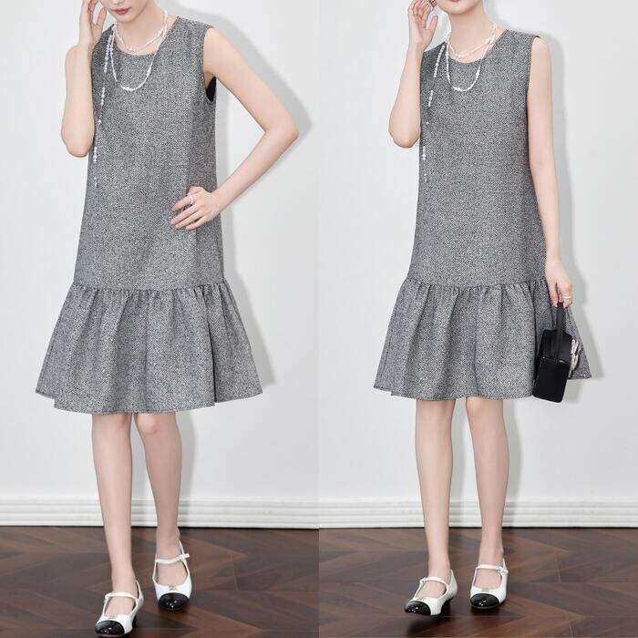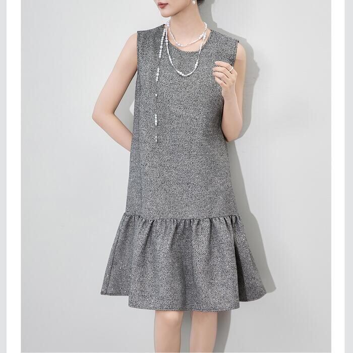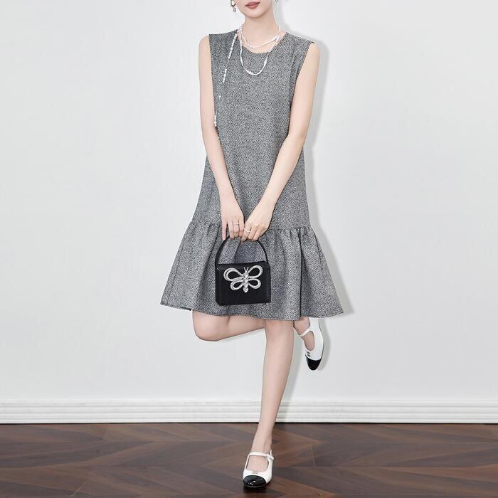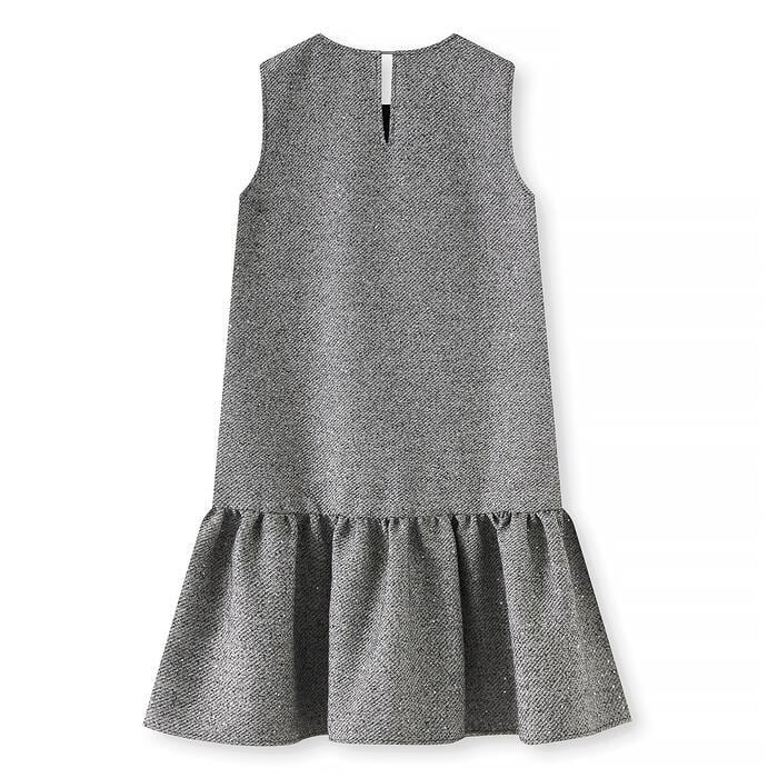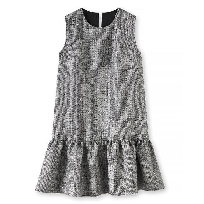 ツイード調の素材に、細かなスパンコールが編み込まれたノースリーブワンピースです。