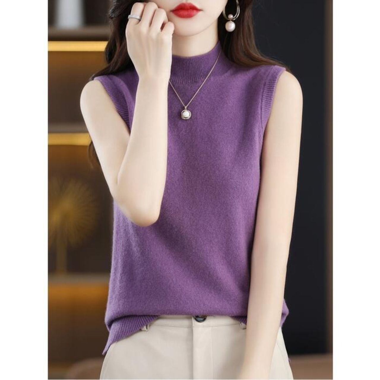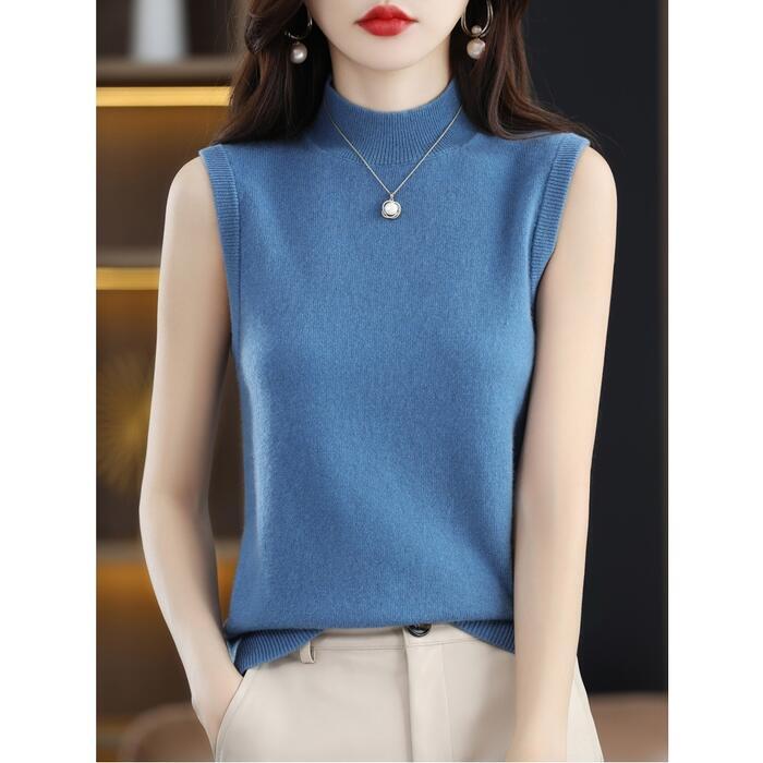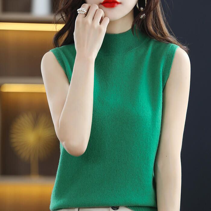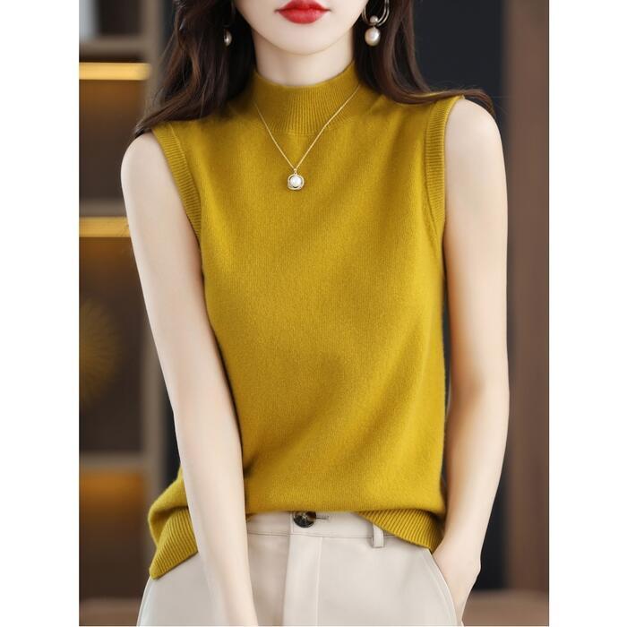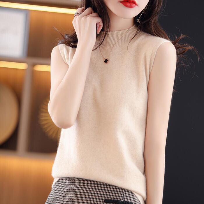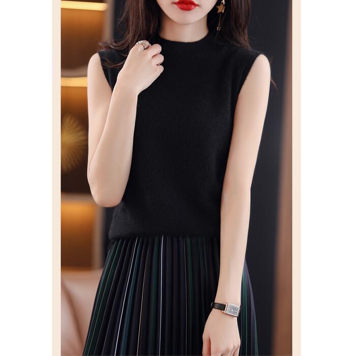 様々なコーディネートに大活躍する、ノースリーブのハイネックニットトップスです。