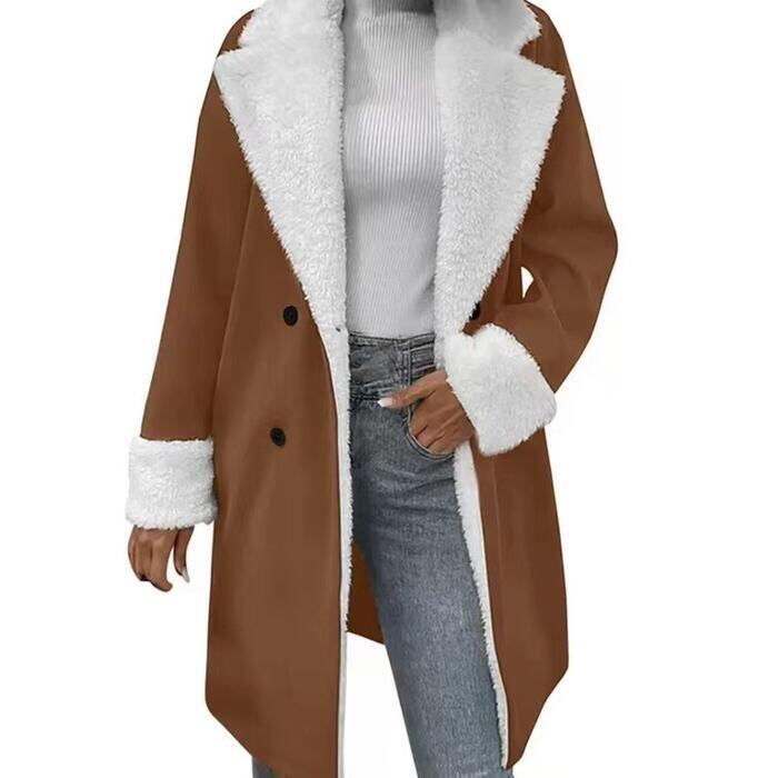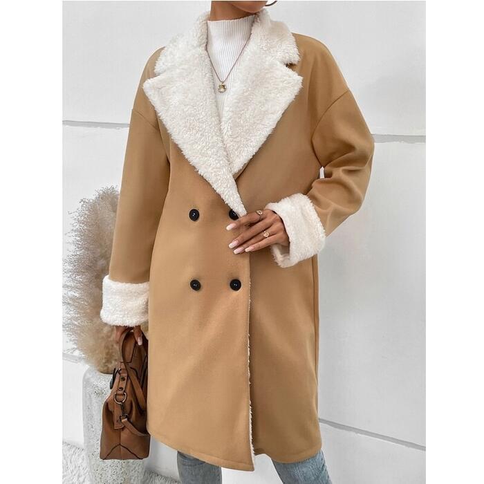 襟と袖口の折り返し部分にボアをドッキングさせたコート。