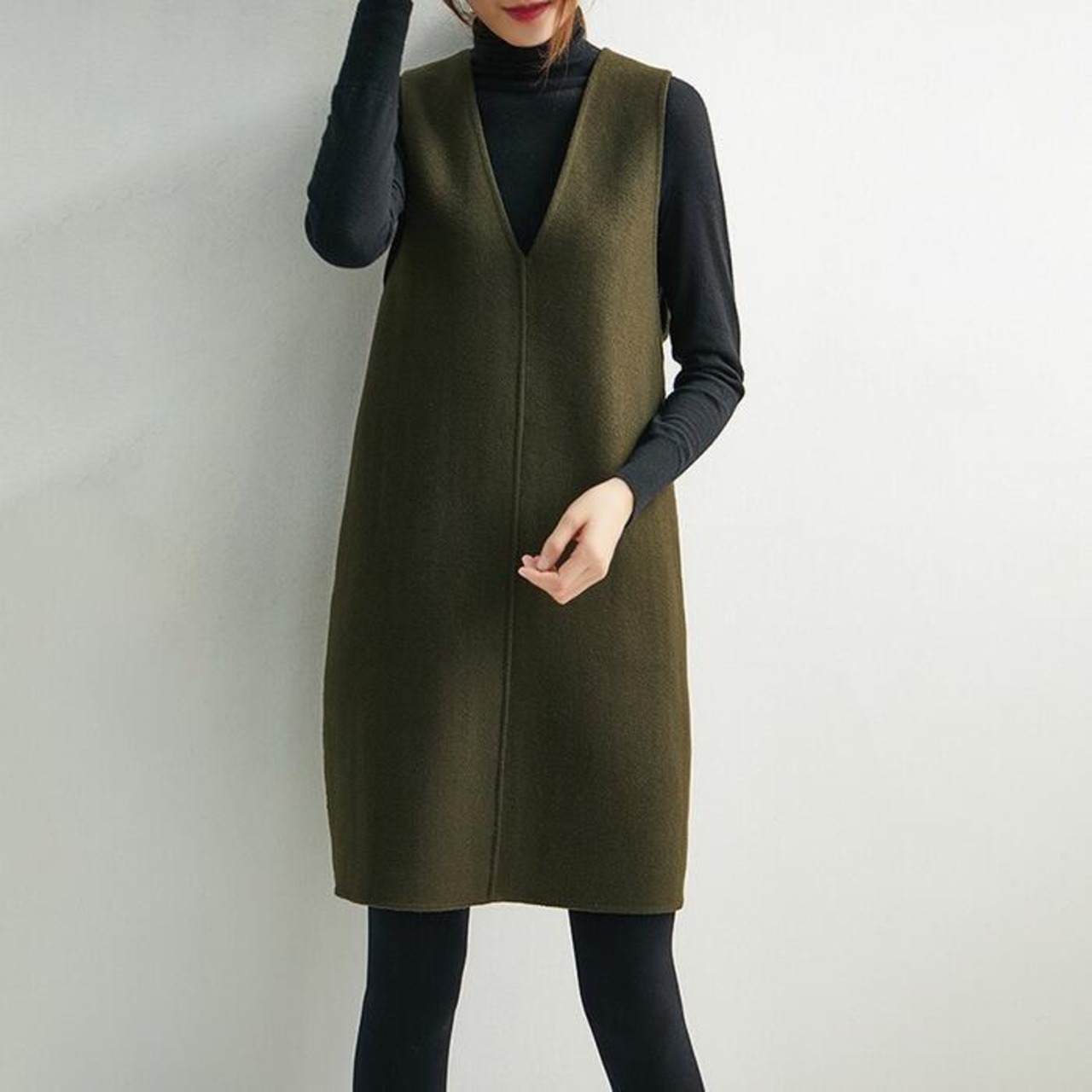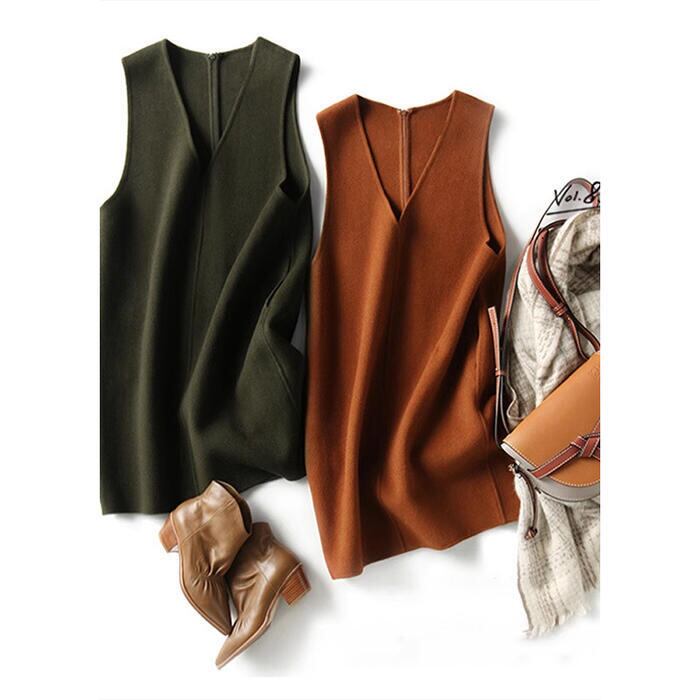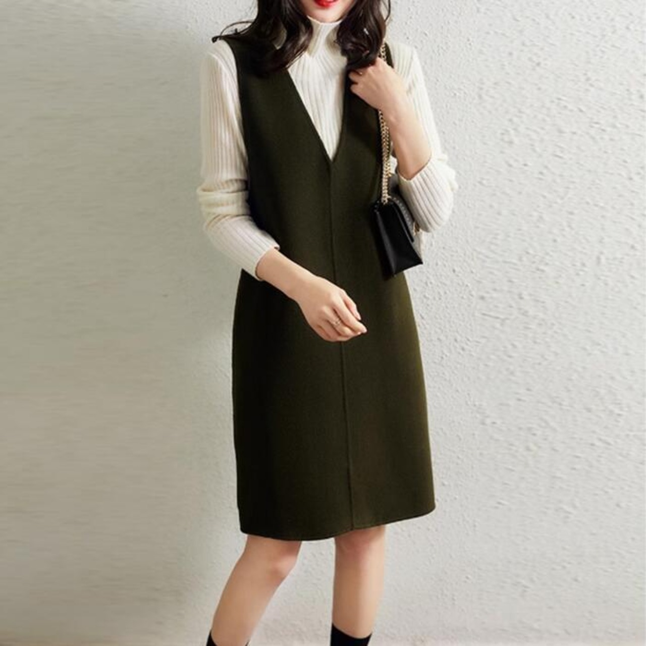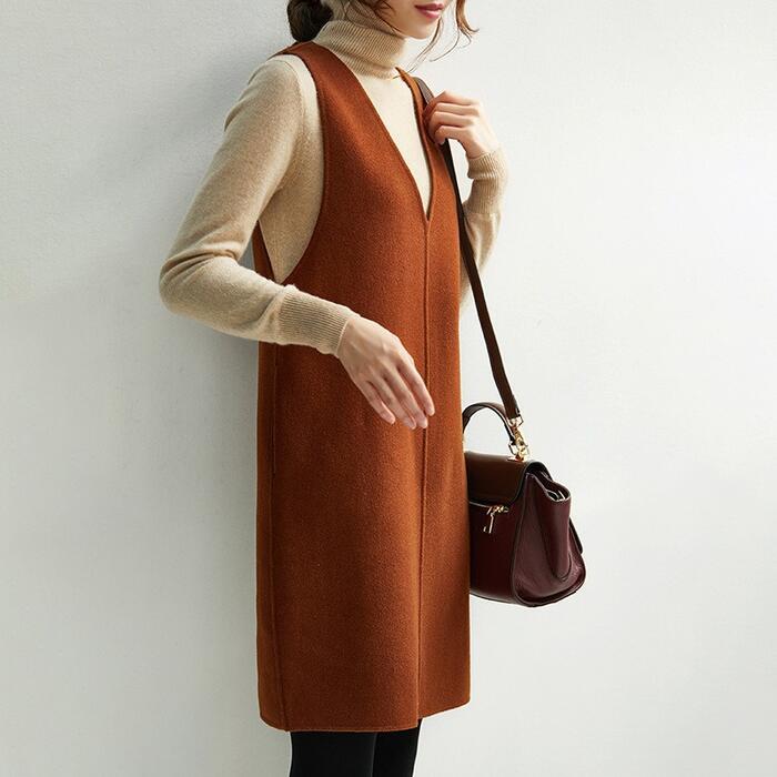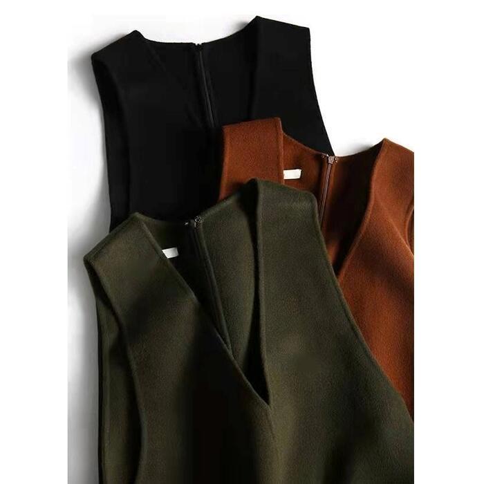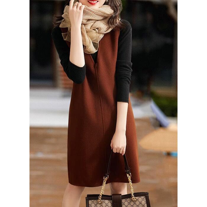 全3色 大きいサイズ 体型カバー エレガント フェミニン おしゃれ ワンピース ドレス レディース きれいめ カジュアル 大人可愛い 春 秋 冬 ニット ウール混 ノースリーブ レイヤード ミニ ひざ丈 ブラウン グリーン 緑 ブラック 黒 20代 30代 40代 50代 S M L XL