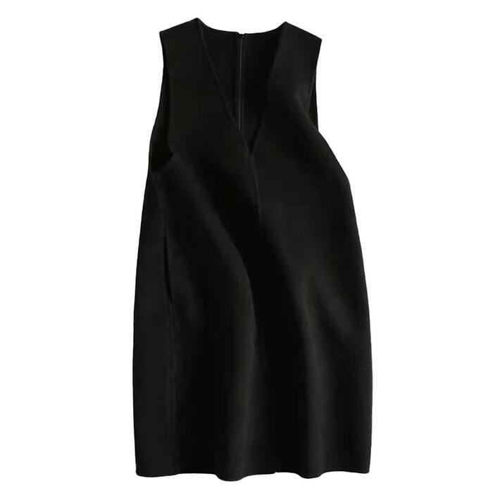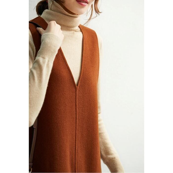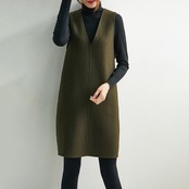 深めのVネックがポイントのノースリーブニットワンピース。