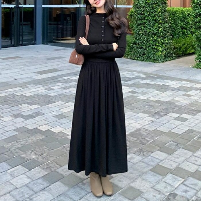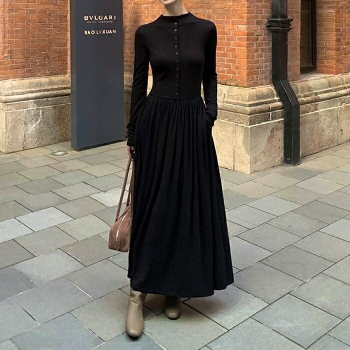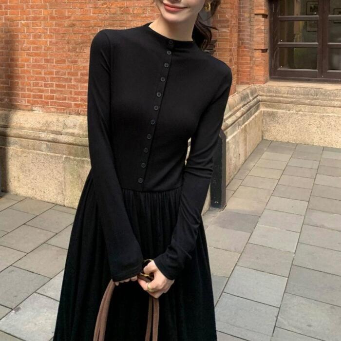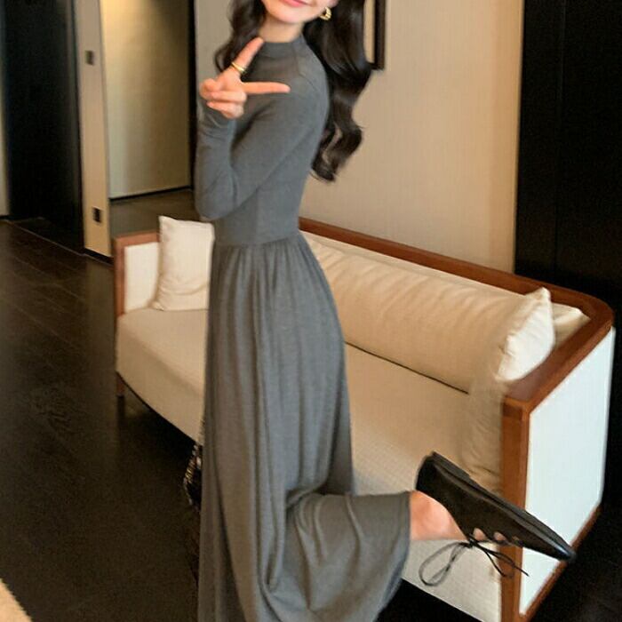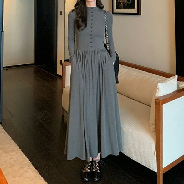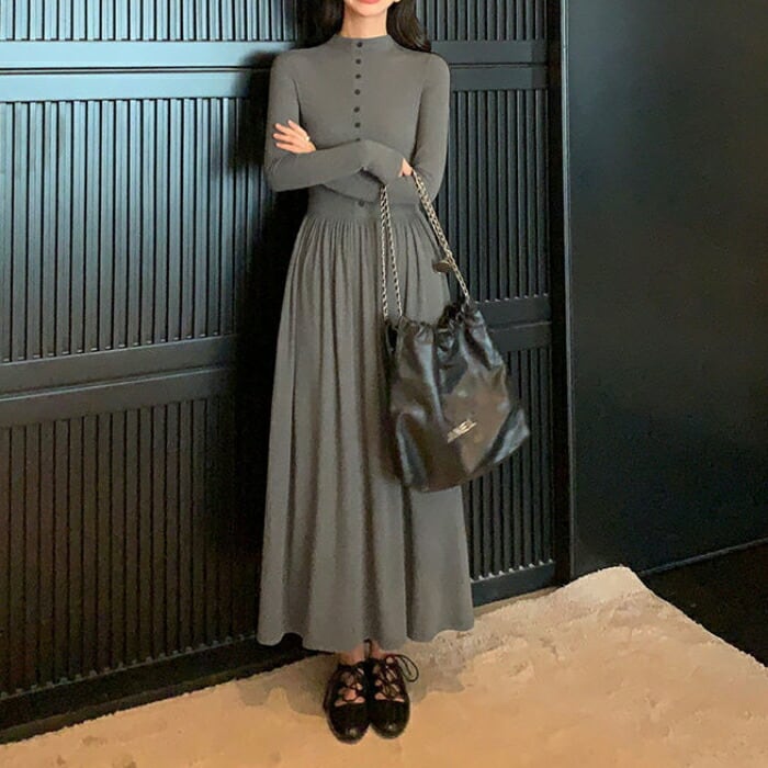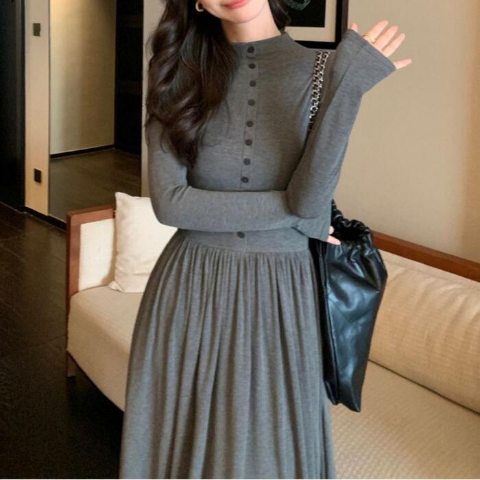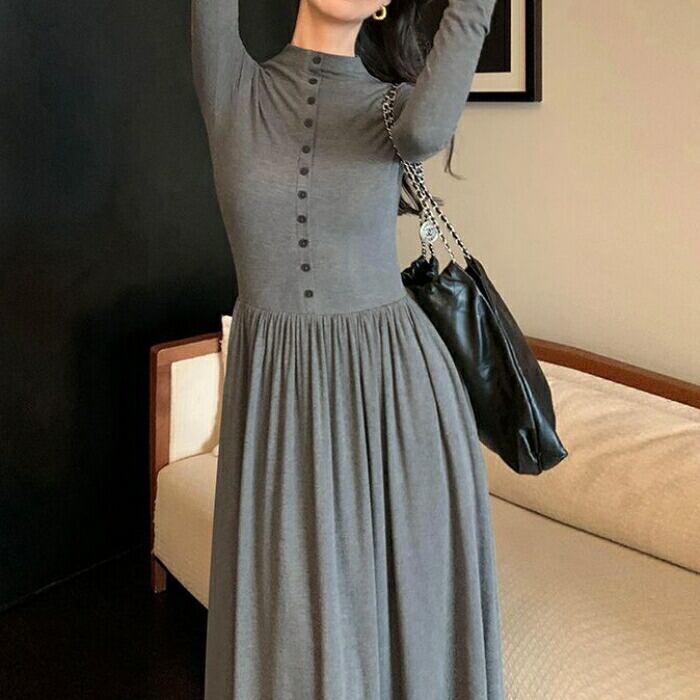 全2色 大きいサイズ 体型カバー エレガント フェミニン おしゃれ ワンピース ドレス レディース きれいめ カジュアル 大人可愛い 春 秋 冬 ニット モックネック ハイネック ボタン 長袖 Aライン ロング丈 グレー ブラック 黒 20代 30代 40代 50代 S M L XL 2XL