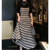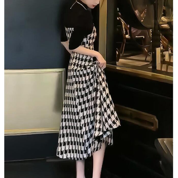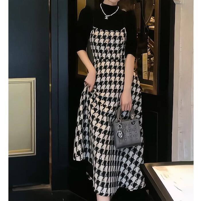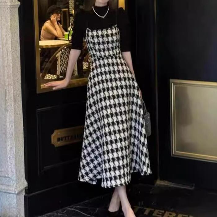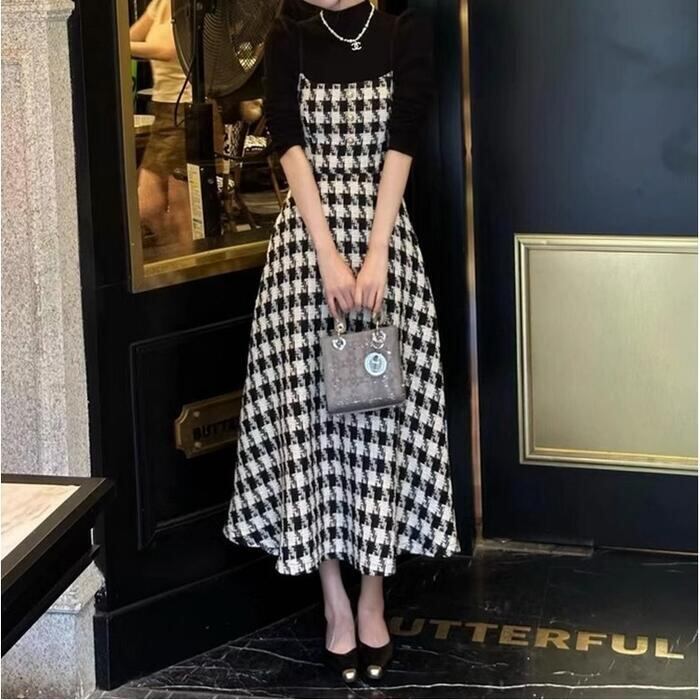 大きいサイズ 体型カバー エレガント フェミニン おしゃれ キャミワンピ セットアップ アンサンブル ワンピース ドレス インナー カットソー レディース きれいめ カジュアル 大人可愛い 春 秋 冬 千鳥格子 レイヤード ハイネック Aライン ミモレ丈 ブラック 黒 20代 30代 40代 50代 S M L XL