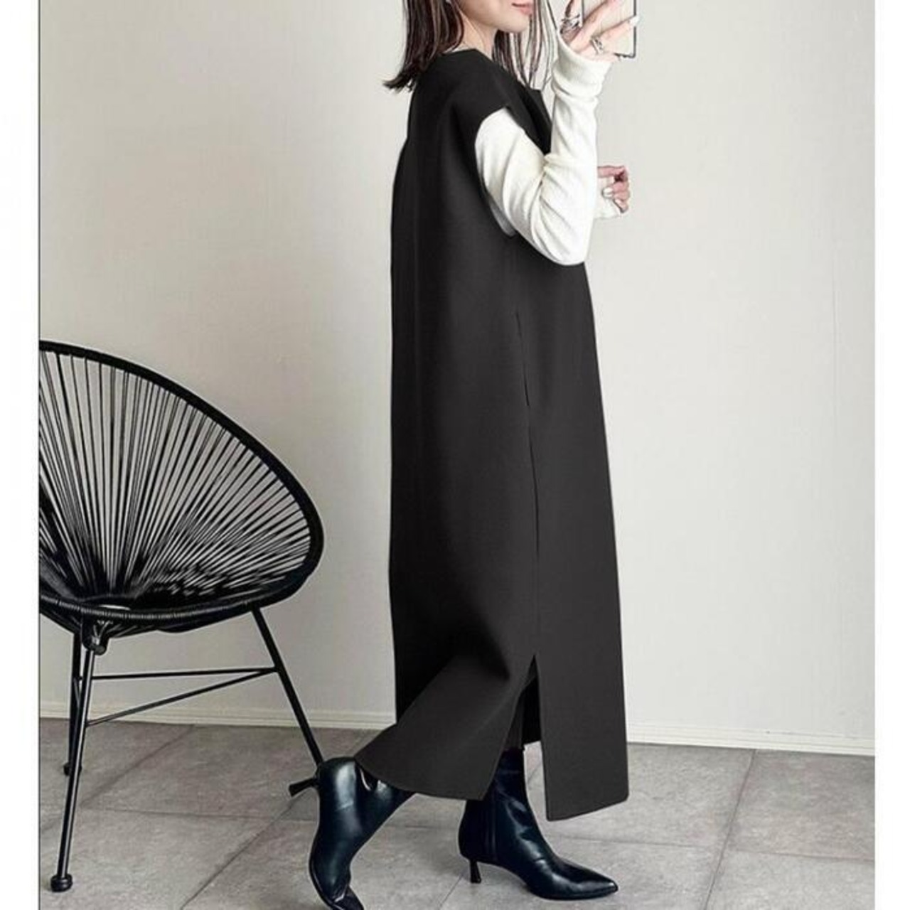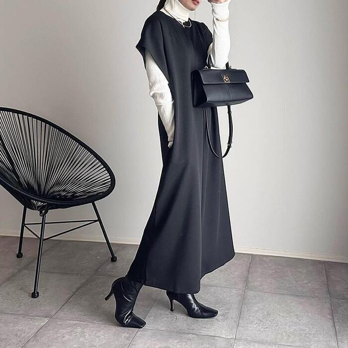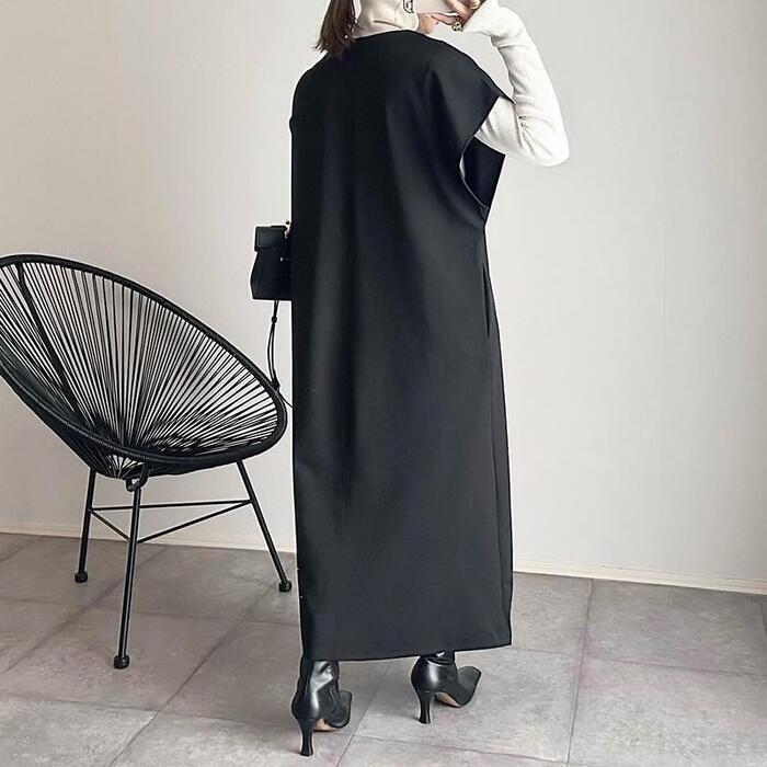 縦のラインを強調する、ストレートなIラインシルエットのロングワンピース。