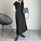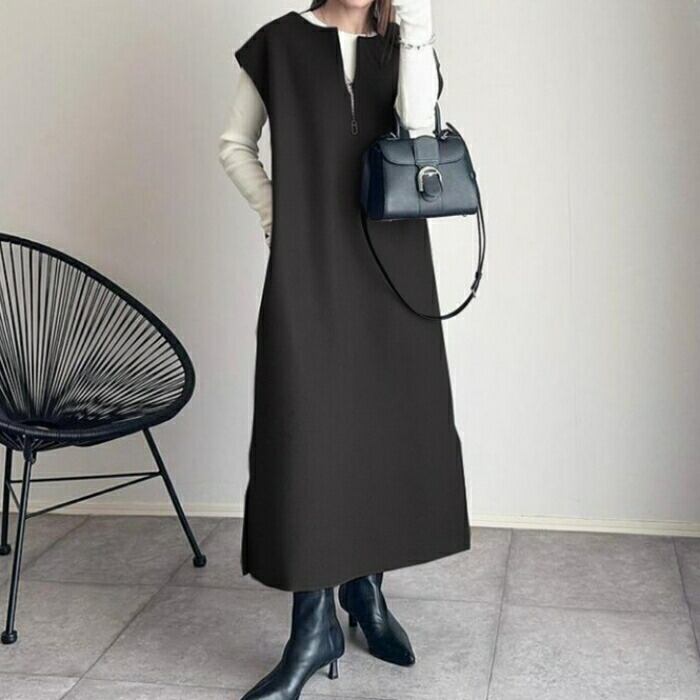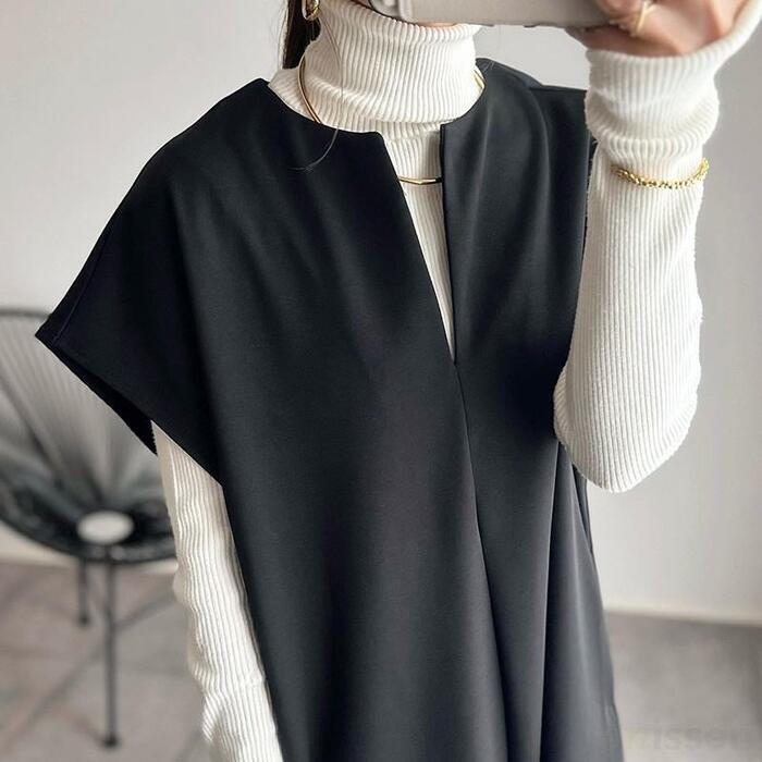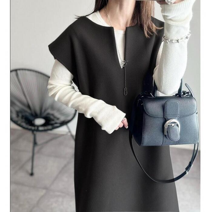 大きいサイズ 体型カバー エレガント フェミニン おしゃれ ゆったり ワンピース ドレス レディース きれいめ カジュアル 大人可愛い 春 秋 冬 ジャンパースカート キーネック ノースリーブ フレンチスリーブ レイヤード ロング丈 ブラック 黒 20代 30代 40代 50代 S M L