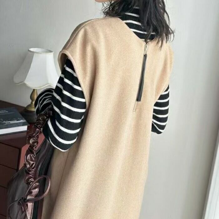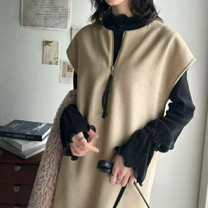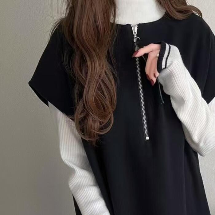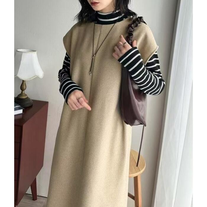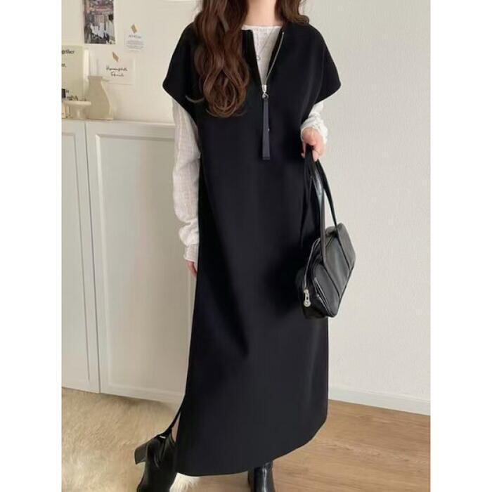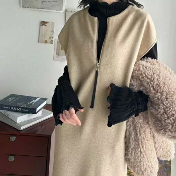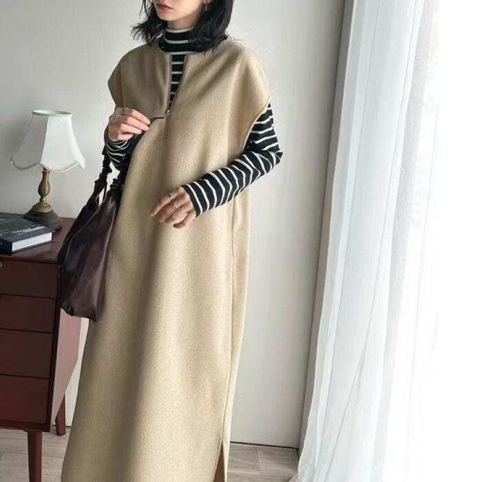 全2色 大きいサイズ 体型カバー エレガント フェミニン おしゃれ ワンピース ドレス レディース きれいめ カジュアル 大人可愛い 春 秋 冬 ニット ハーフジップ ノースリーブ Aライン レイヤード 2way ロング丈 ベージュ ブラック 黒 20代 30代 40代 50代 フリー