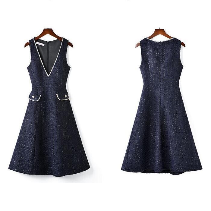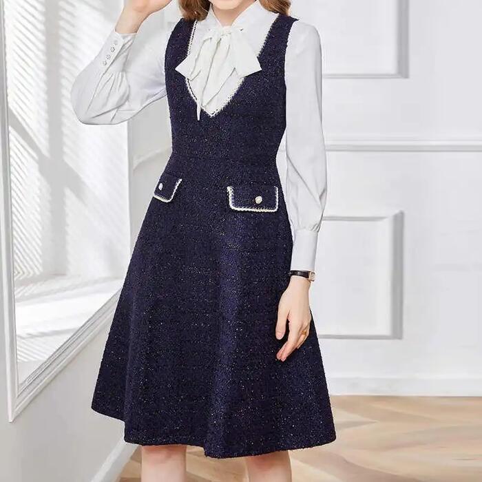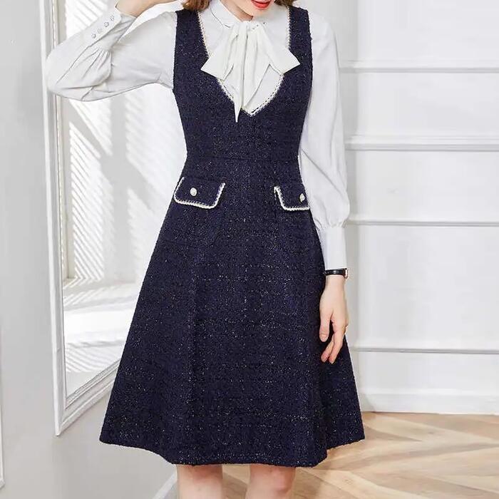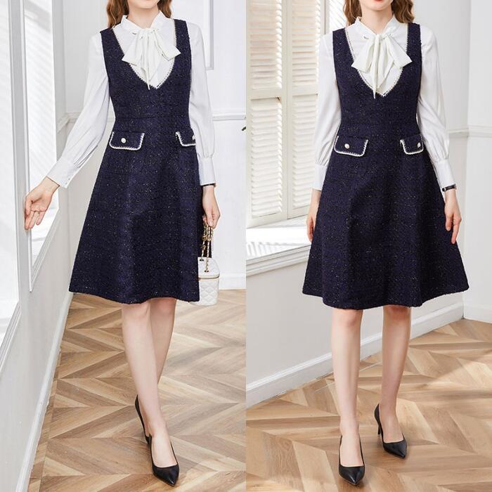 全2色 大きいサイズ 体型カバー エレガント フェミニン おしゃれ ワンピース ドレス レディース きれいめ カジュアル 大人可愛い 春 秋 冬 ノースリーブ Vネック レイヤード ラメ Aライン ジャンパースカート ひざ丈 ネイビー ブラック 黒 20代 30代 40代 50代 M L XL 2XL 3XL