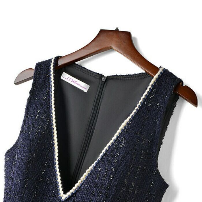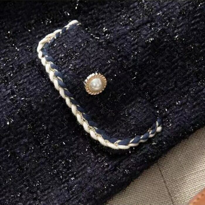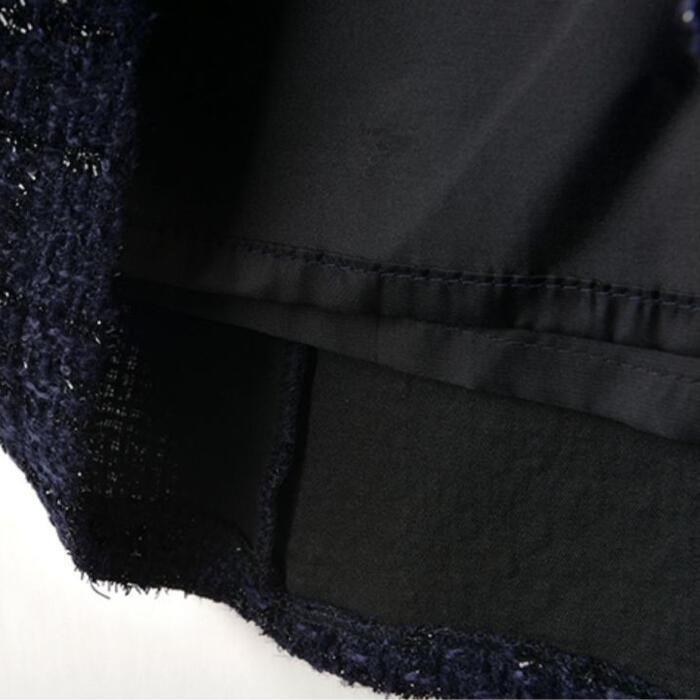 キラキラと輝くラメ糸が織り込まれたツイード調で、大人の女性の特別な装いに最適な一着です。