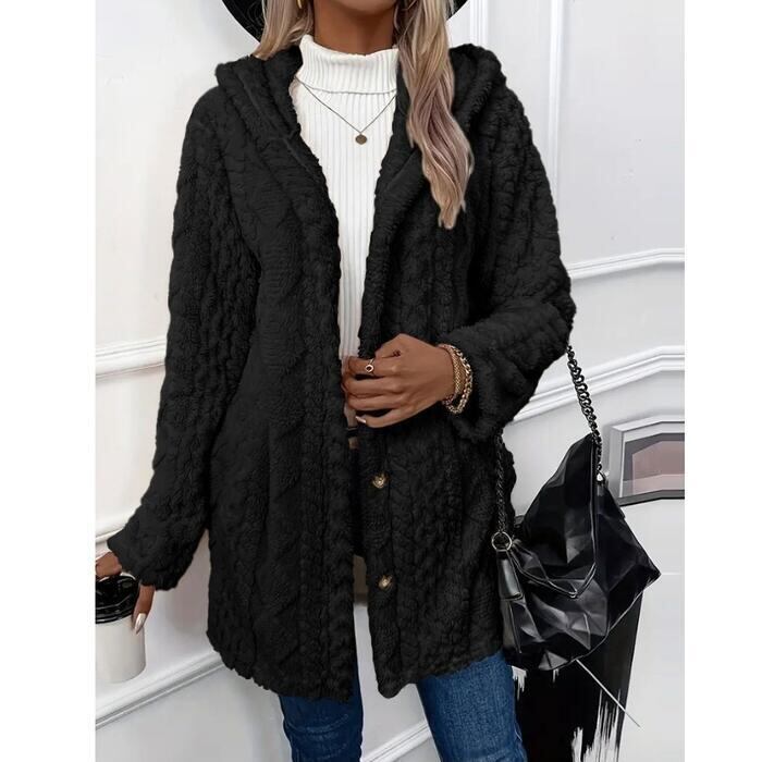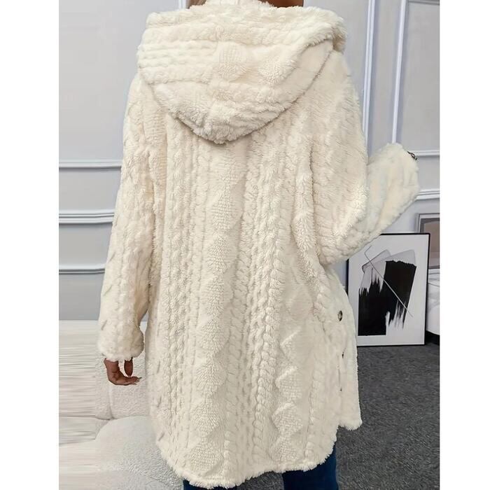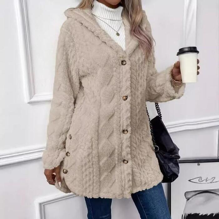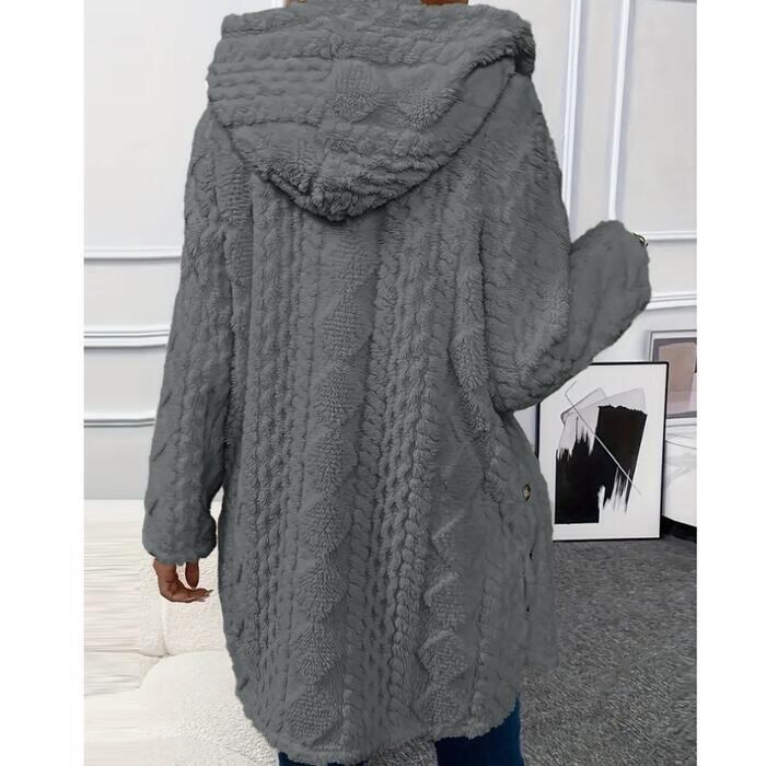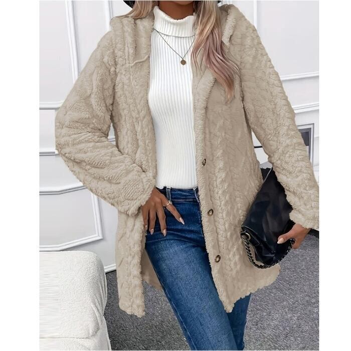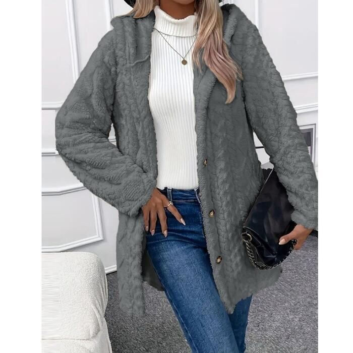 カジュアルさと暖かな雰囲気のある、ミドル丈のフード付きコート。