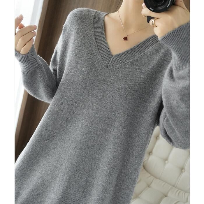 広めに開いたVネックがデコルテを綺麗に見せ、女性らしい抜け感を演出。