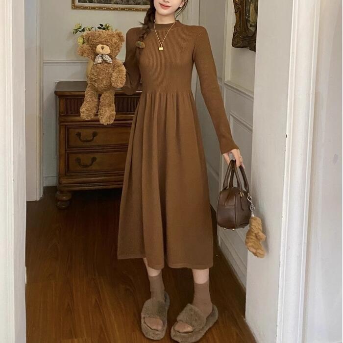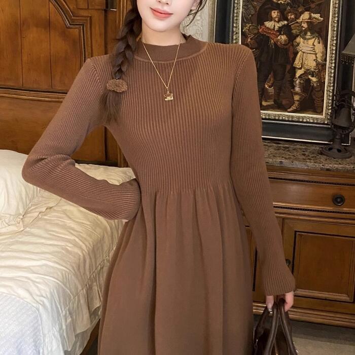 全5色 大きいサイズ 体型カバー エレガント フェミニン おしゃれ シンプル トップス ワンピース ドレス レディース きれいめ カジュアル 大人可愛い 春 秋 冬 ニット 長袖 モックネック フレア Aライン 無地 ブラウン グレー ベージュ レッド 赤 ブラック 黒 20代 30代 40代 50代 S M L