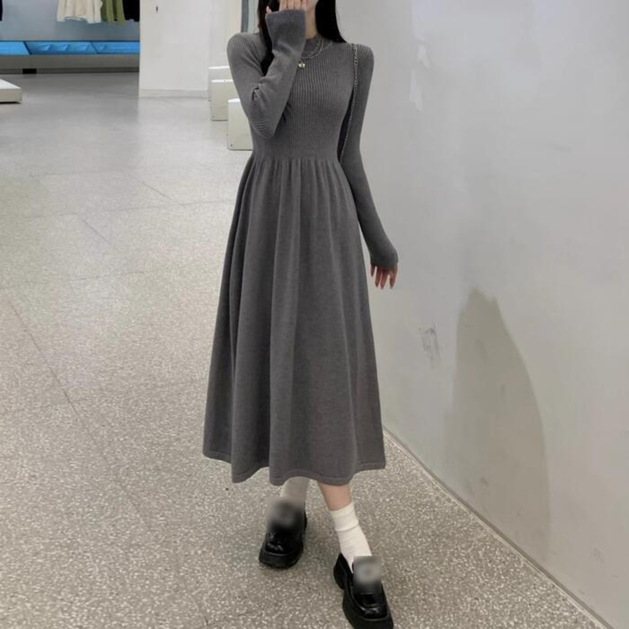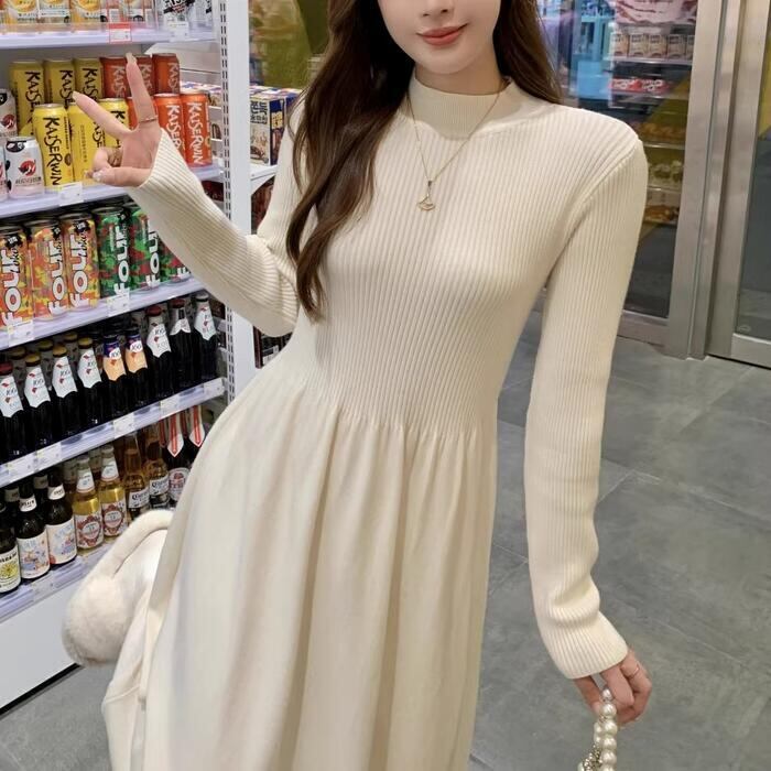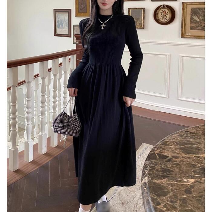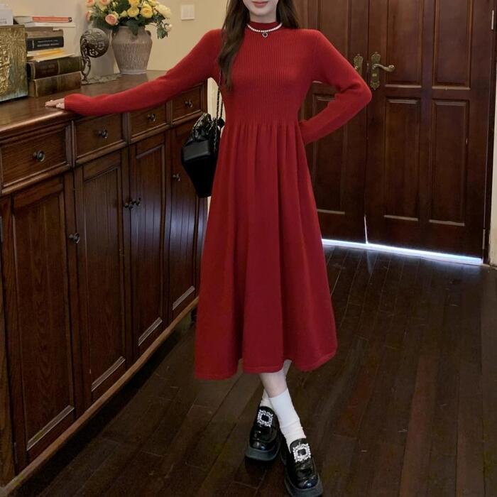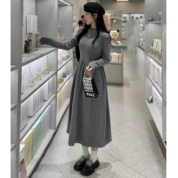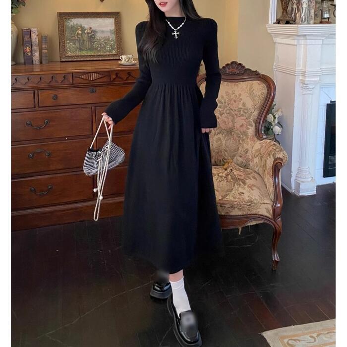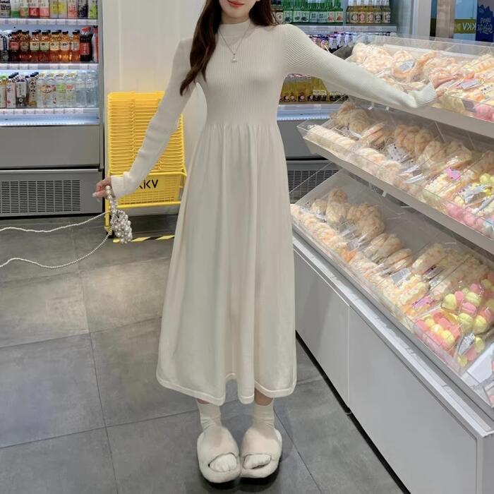上品さと可愛らしさが併せ持った、長袖のハイネックニットワンピースです。