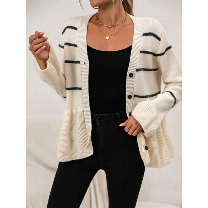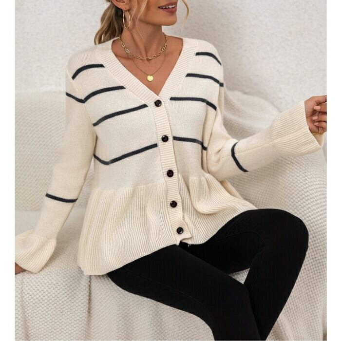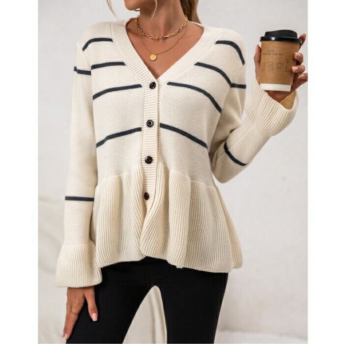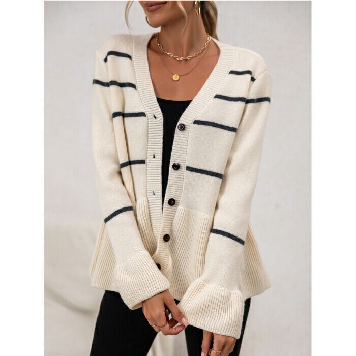 大きいサイズ 体型カバー エレガント フェミニン おしゃれ トップス ニット カーディガン セーター レディース きれいめ カジュアル 大人可愛い 春 秋 冬 ボーダー ペプラム フレア 羽織り Vネック 長袖 ベージュ 20代 30代 40代 50代 S M L