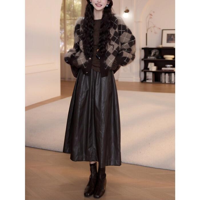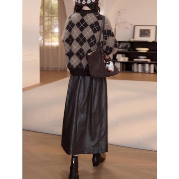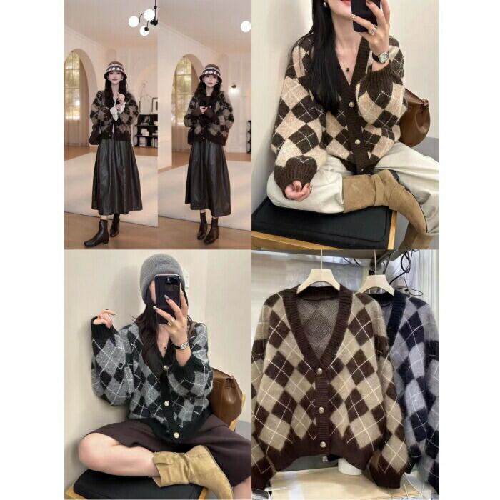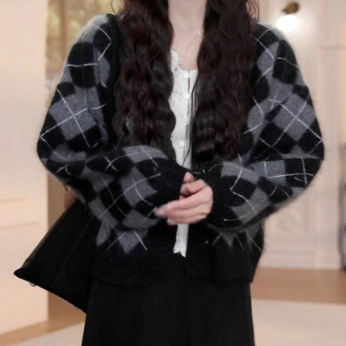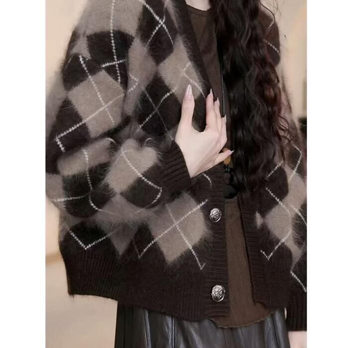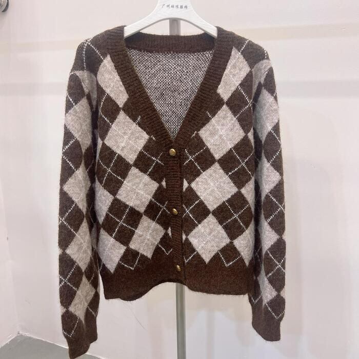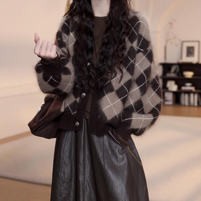 全2色 大きいサイズ 体型カバー エレガント フェミニン おしゃれ トップス ニット セーター カーディガン レディース きれいめ カジュアル 大人可愛い 春 秋 冬 アウター ジャケット 羽織り アーガイル チェック 長袖 ブラウン グレー 20代 30代 40代 50代 フリー