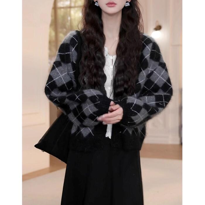 ふんわり柔らかな質感のアーガイル柄ニットカーディガンです。