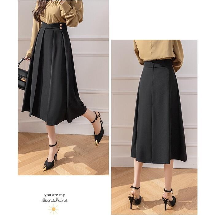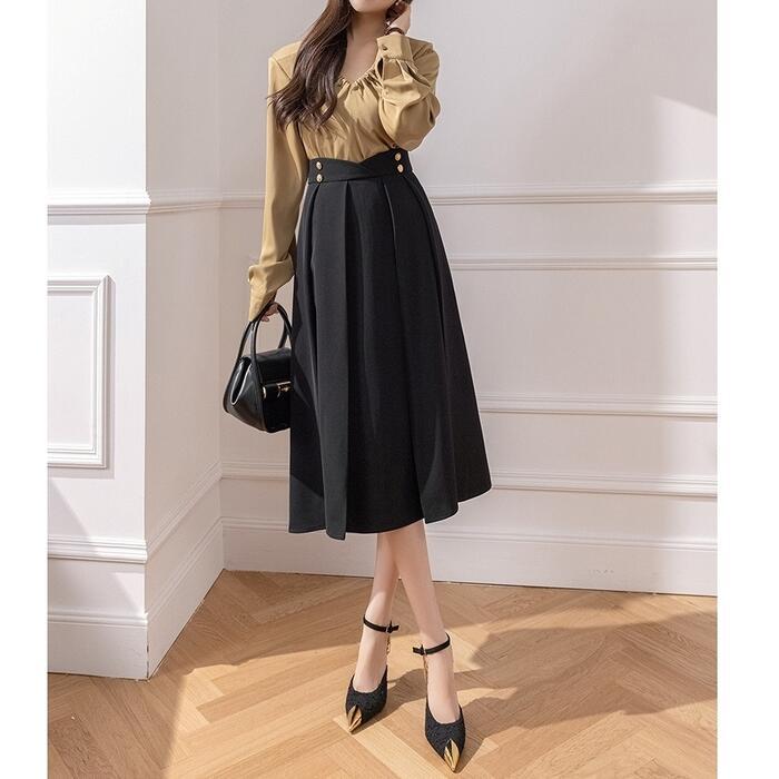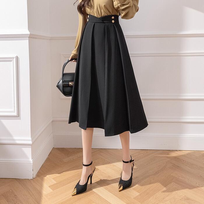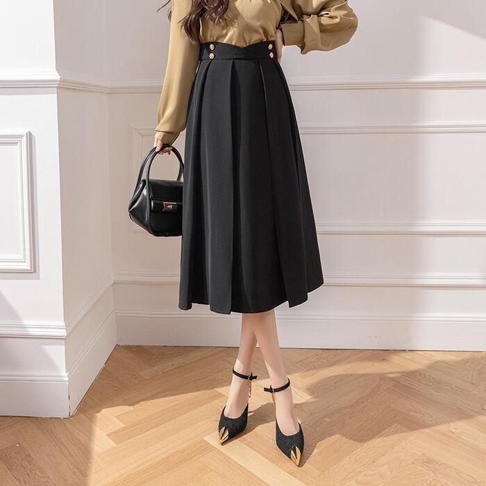 全2色 大きいサイズ 体型カバー フェミニン エレガント おしゃれ シンプル 通勤 ボトムス スカート きれいめ カジュアル 大人可愛い 春 秋 冬 ボックスプリーツ タック フレア Aライン ミモレ丈 ハイウエスト ブラック 黒 ブラウン 20代 30代 40代 50代 S M L XL 2XL