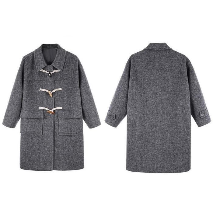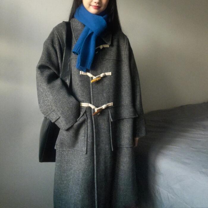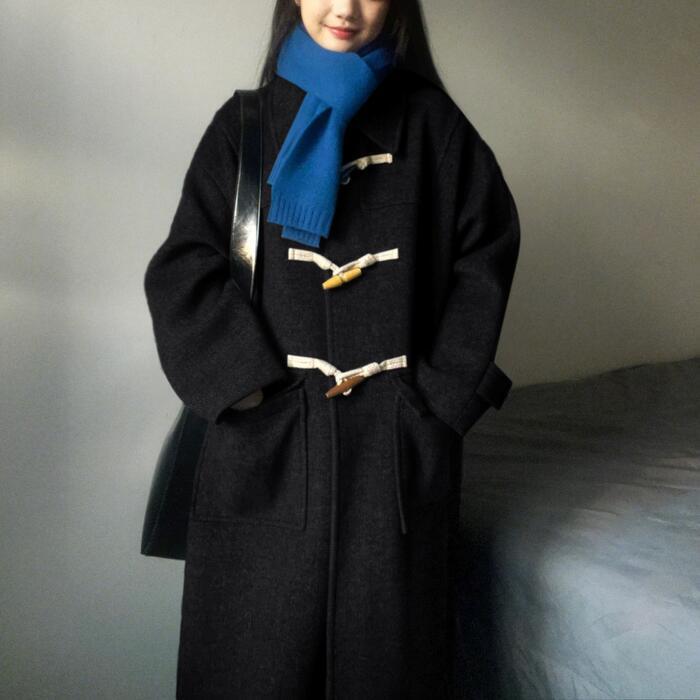 3色のドグルボタンがさりげないポイントの中綿入りダッフルコート。
