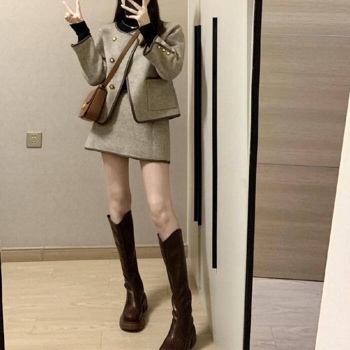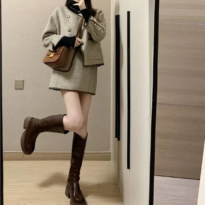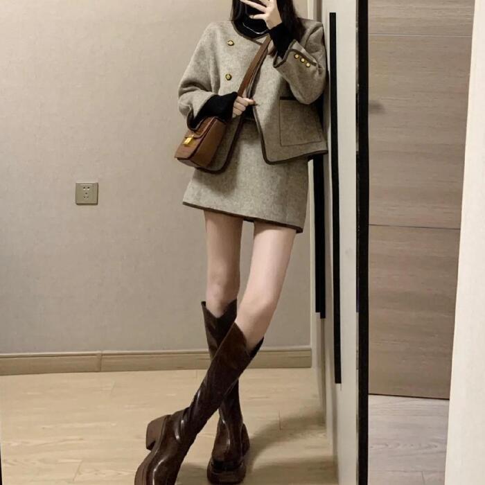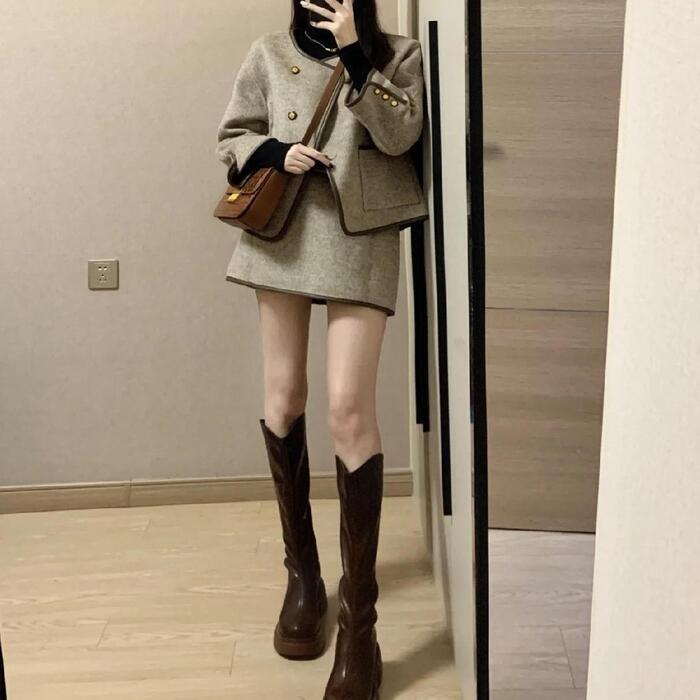 ハイネックのインナーとロングブーツを合わせれば、トレンド感あふれる着こなしが完成します。