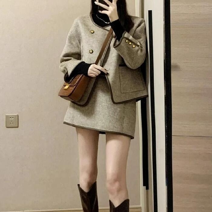 大きいサイズ 体型カバー エレガント フェミニン おしゃれ オケージョン シンプル セットアップ スーツ ジャケット スカート 春 秋 冬 レディース きれいめ カジュアル 大人可愛い ショートジャケット 長袖 ノーカラー ミニスカート ベージュ 20代 30代 40代 50代 M L XL