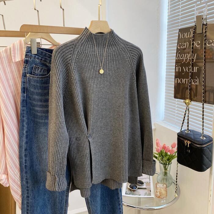 首元は程よい詰まりのハイネックデザインで、上品かつ大人っぽい印象に。