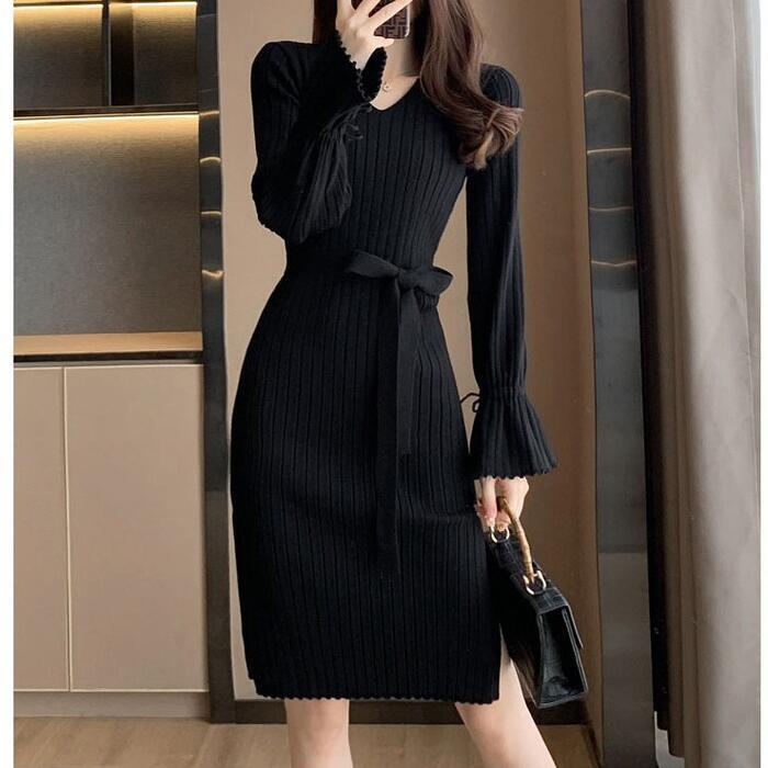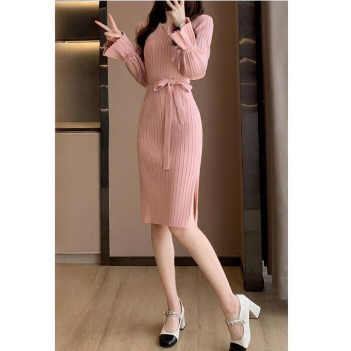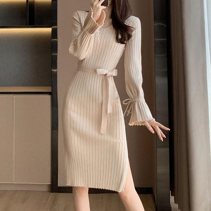 全4色 大きいサイズ 体型カバー エレガント フェミニン おしゃれ シンプル ひざ丈 ニット ワンピース ドレス レディース きれいめ カジュアル 大人可愛い 春 秋 冬 長袖 リブ キャンディスリーブ ベージュ ピンク レッド 赤 ブラック 黒 20代 30代 40代 50代 S M L XL