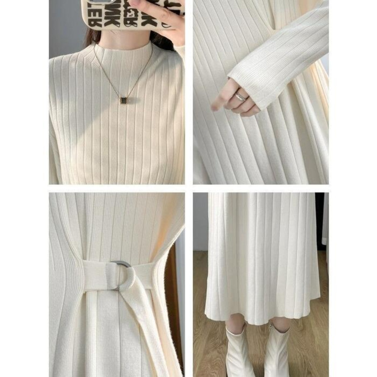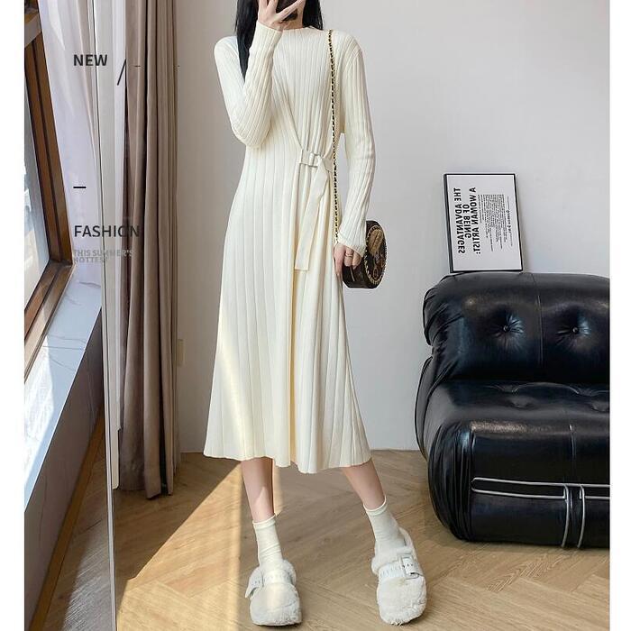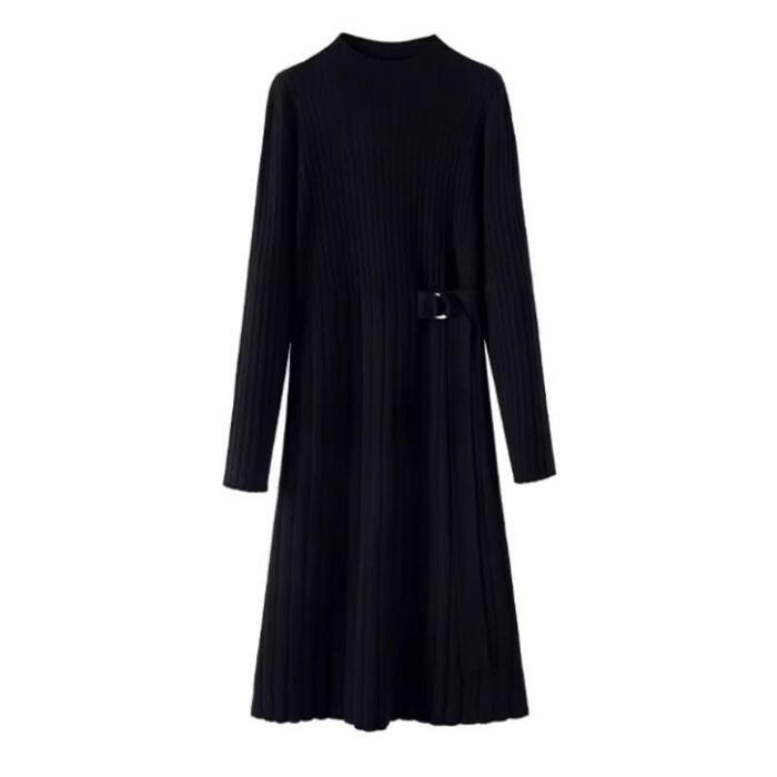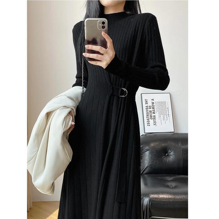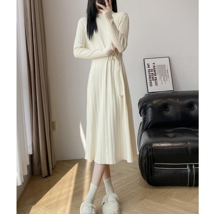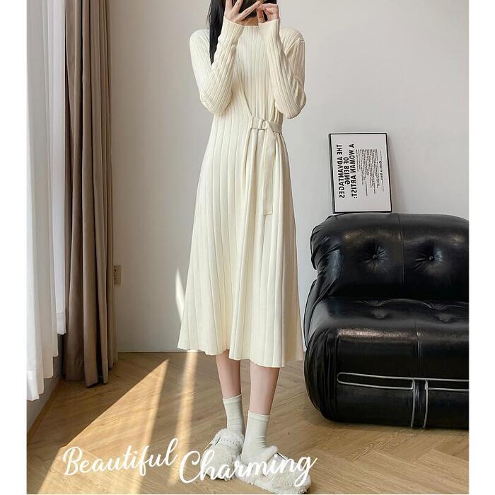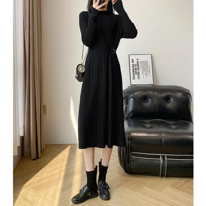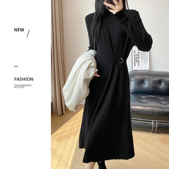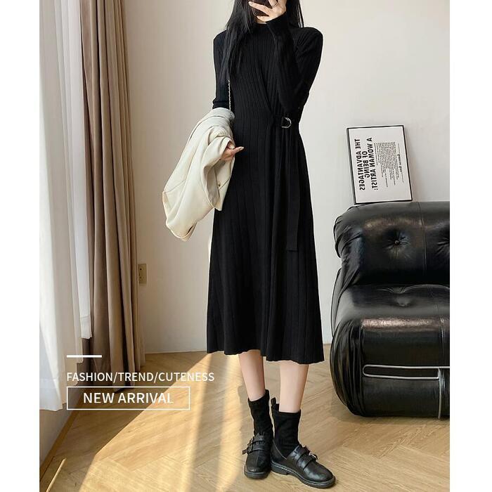 全2色 大きいサイズ 体型カバー エレガント フェミニン おしゃれ シンプル ミディ丈 ニット ワンピース ドレス レディース きれいめ カジュアル 大人可愛い 春 秋 冬 長袖 リブ ハイネック サイドベルト Aライン ベージュ ブラック 黒 20代 30代 40代 50代 S M L XL
