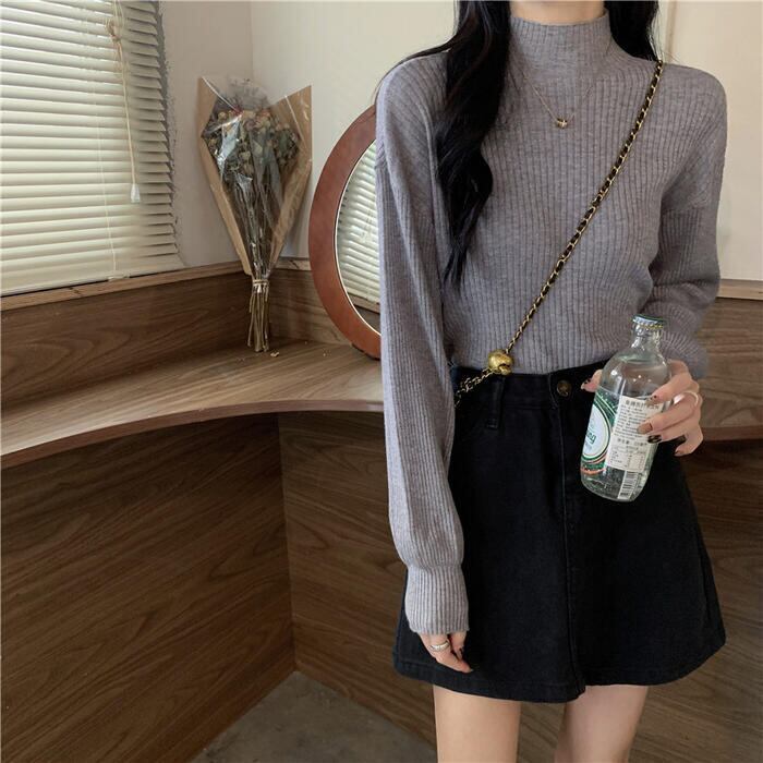 首元は高すぎないボトルネックで、上品ですっきりとした印象を与えます。