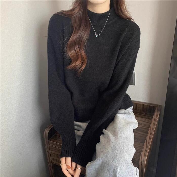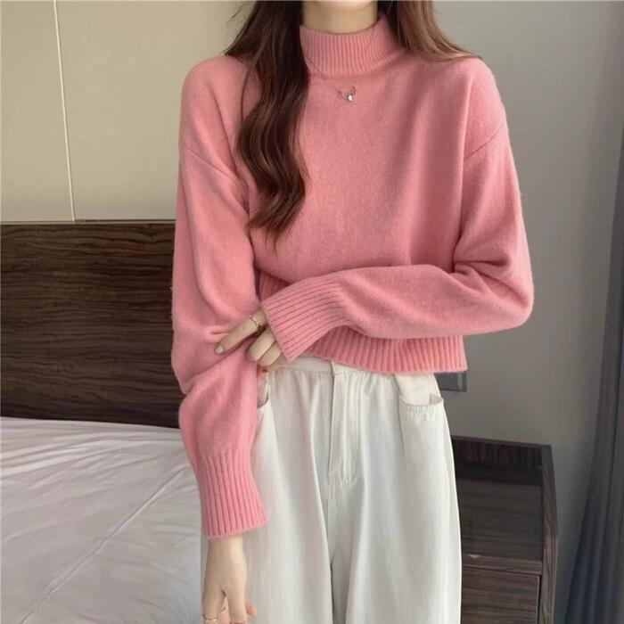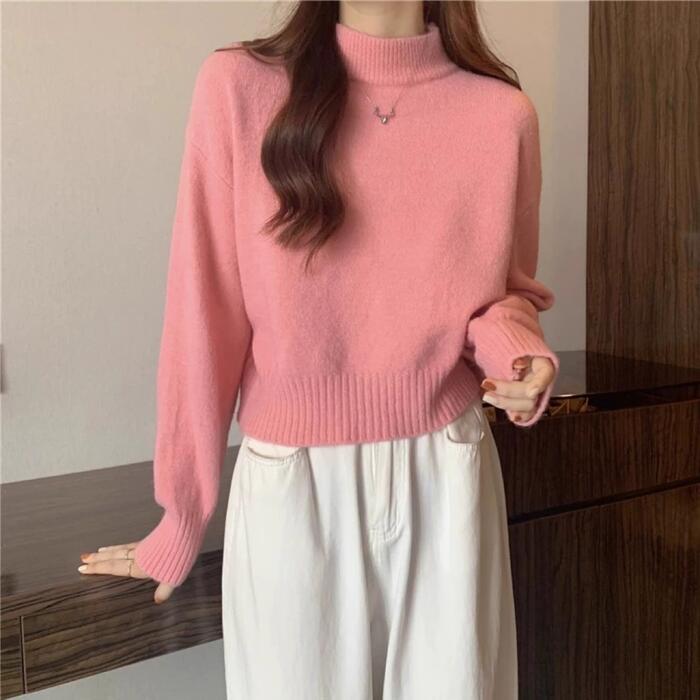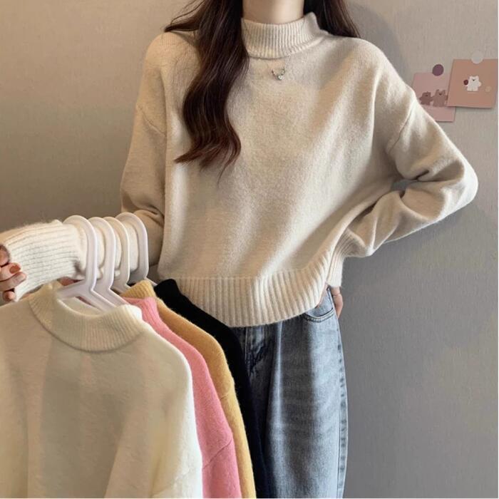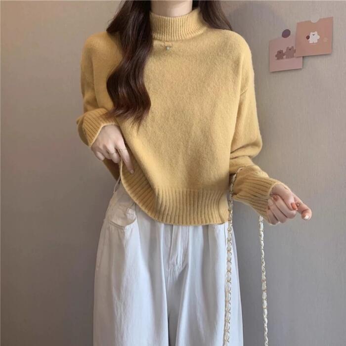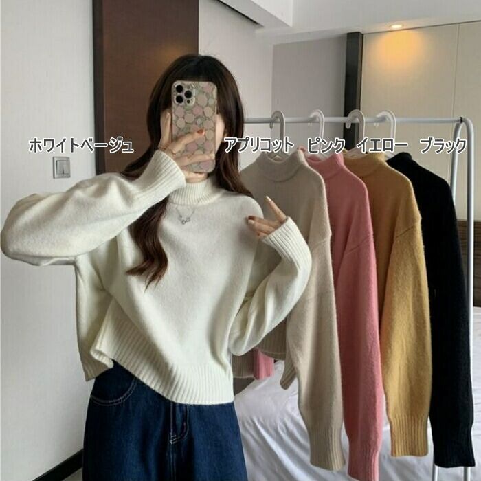 全5色 大きいサイズ 体型カバー エレガント フェミニン おしゃれ セーター カットソー シンプル トップス ニット レディース きれいめ カジュアル 大人可愛い 春 秋 冬 長袖 ハイネック ショート丈 無地 ホワイト 白 ベージュ ピンク ブラック 黒 イエロー 20代 30代 40代 50代 S M L XL