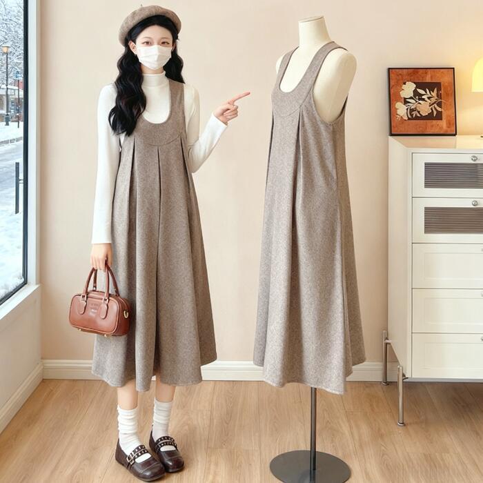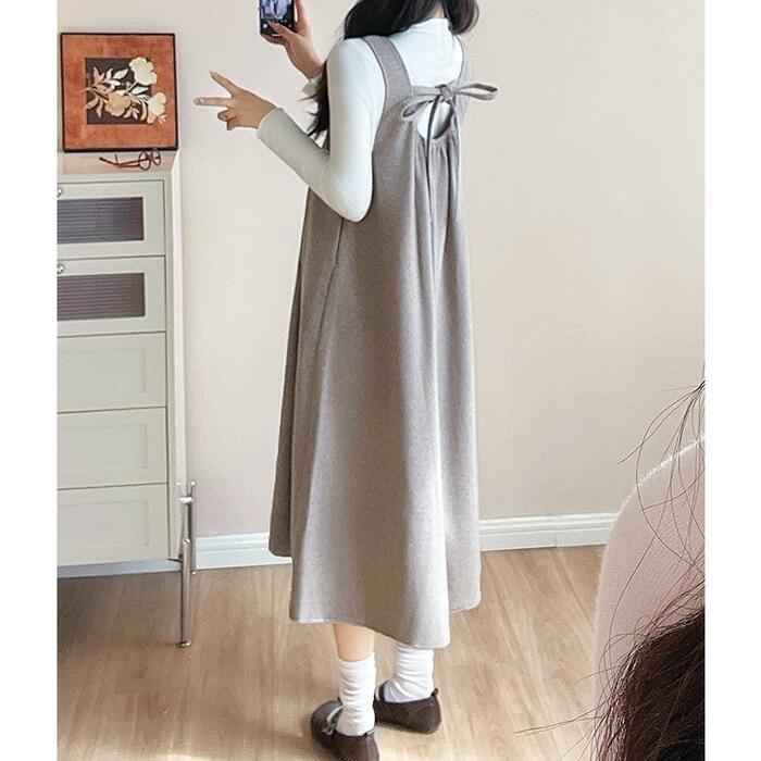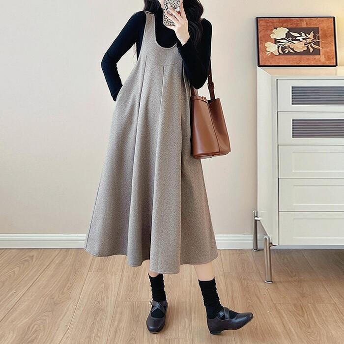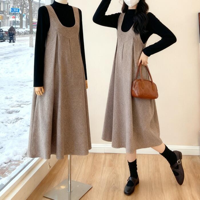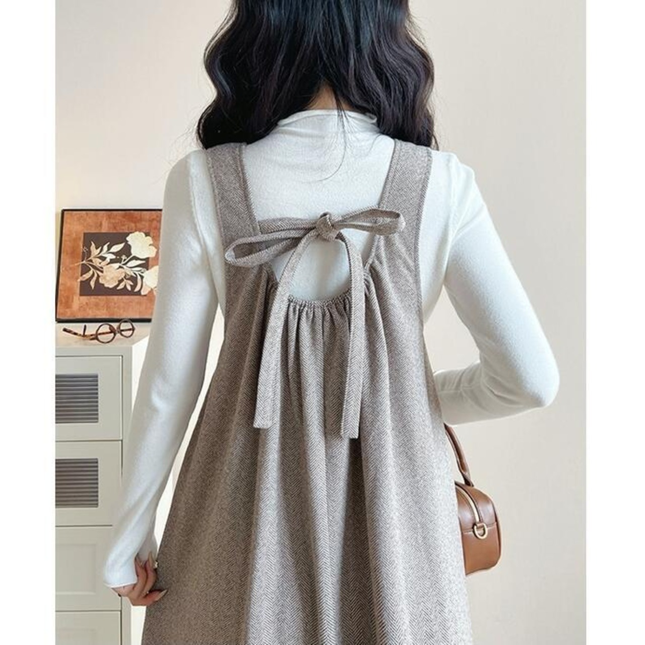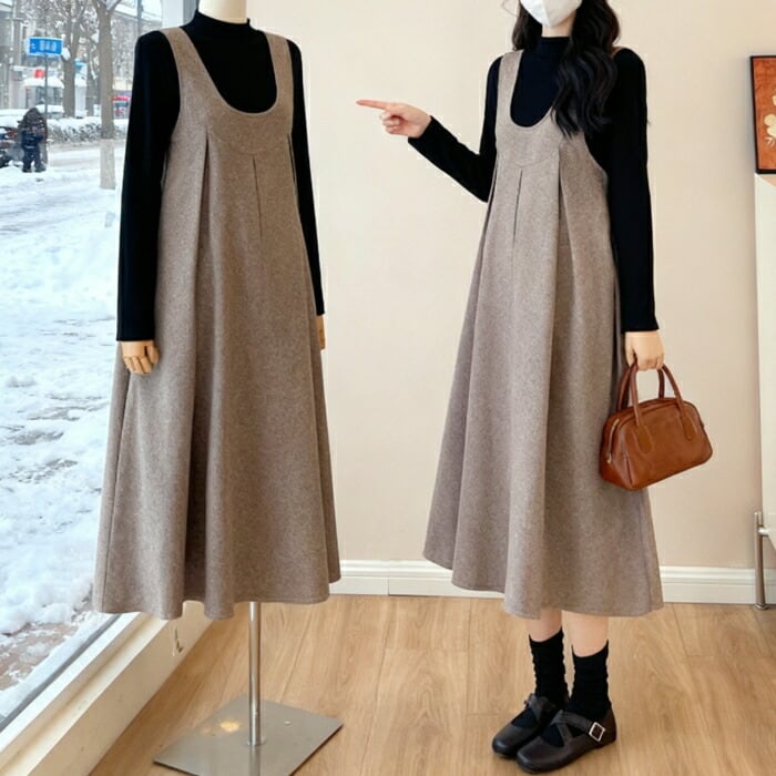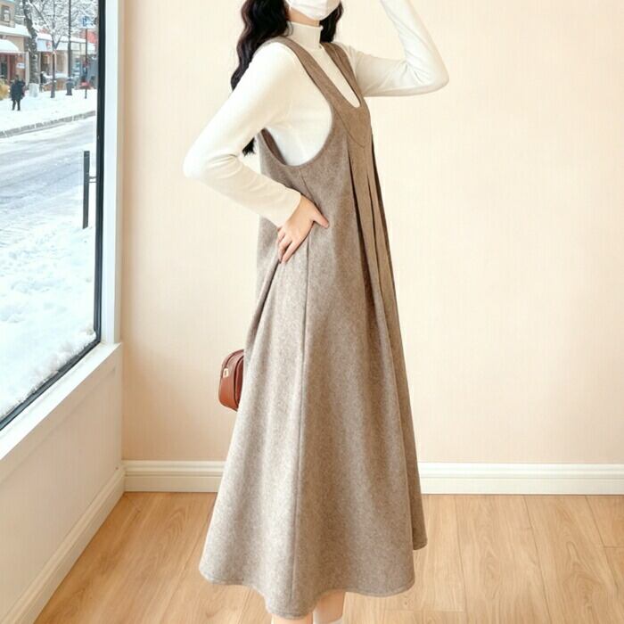 ハイネックのインナーニットとジャンパースカートのセットアップ。