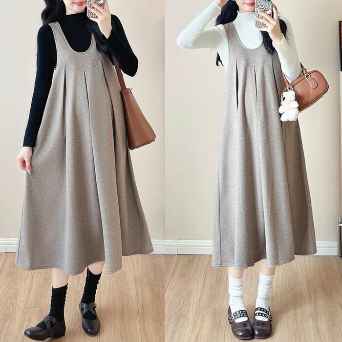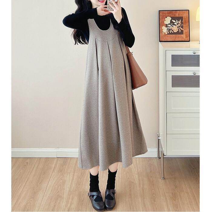 全2色 大きいサイズ 体型カバー エレガント フェミニン おしゃれ 2点セット レイヤード アンサンブル ミモレ丈 インナー セットアップ ワンピース カットソー レディース きれいめ カジュアル 大人可愛い 春 秋 冬 ハイネック ジャンパースカート ブラック 黒 ホワイト 白 ベージュ 20代 30代 40代 50代 M L XL 2XL