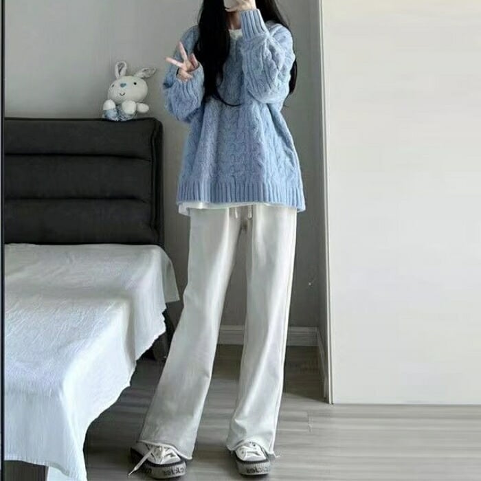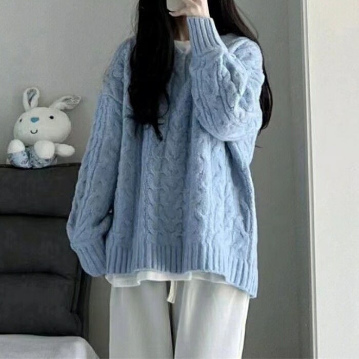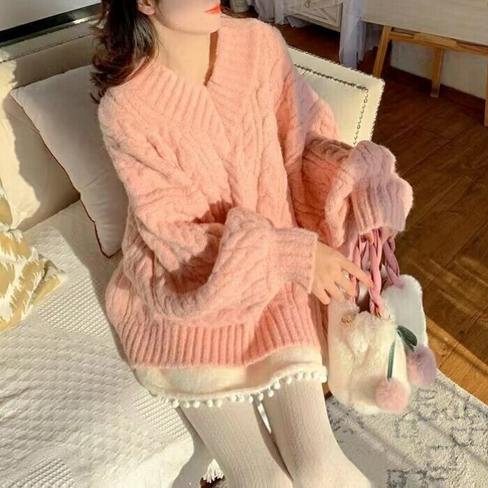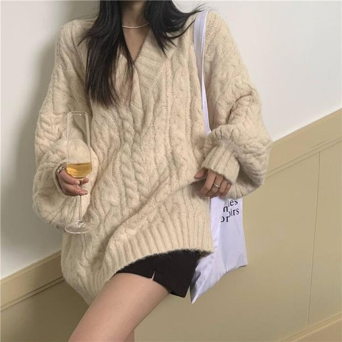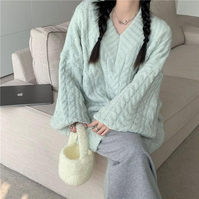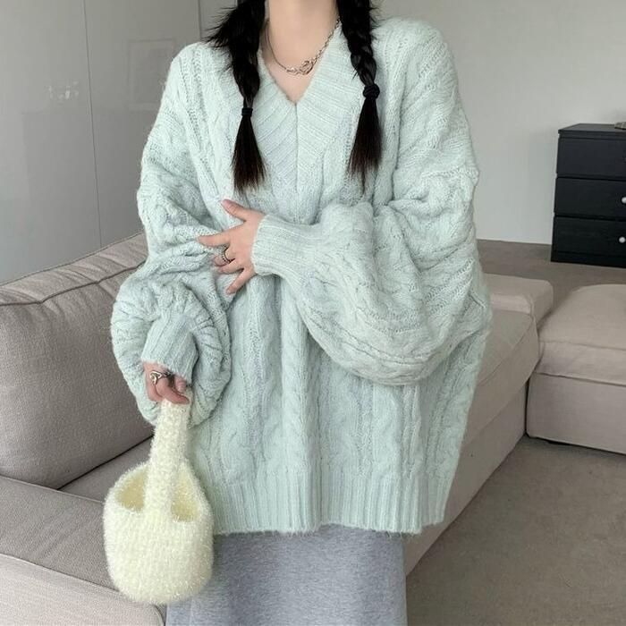 全4色 大きいサイズ 体型カバー エレガント フェミニン おしゃれ カットソー シンプル ゆったり トップス ニット レディース きれいめ カジュアル 大人可愛い 春 秋 冬 長袖 セーター Vネック ケーブル ホワイト 白 ピンク グリーン 緑 ブルー 青 20代 30代 40代 50代 M L XL 2XL