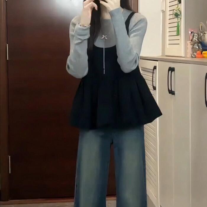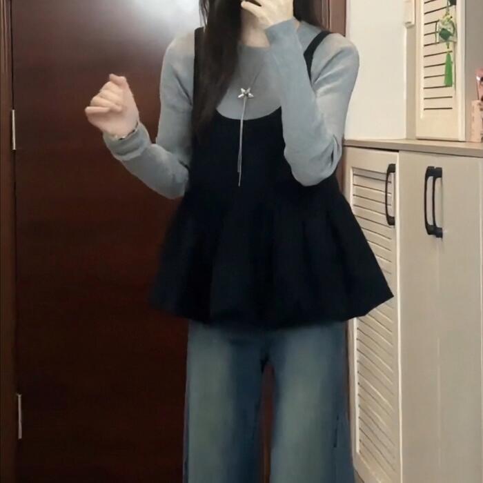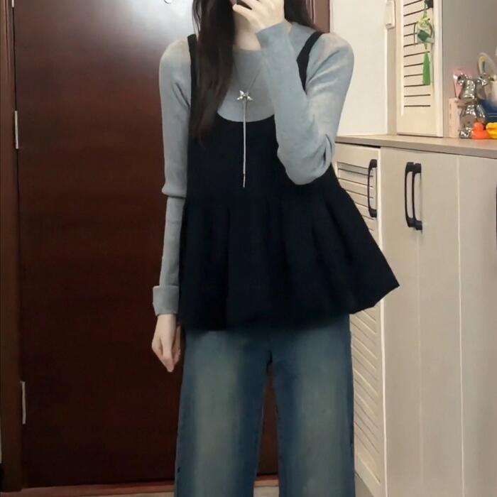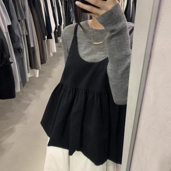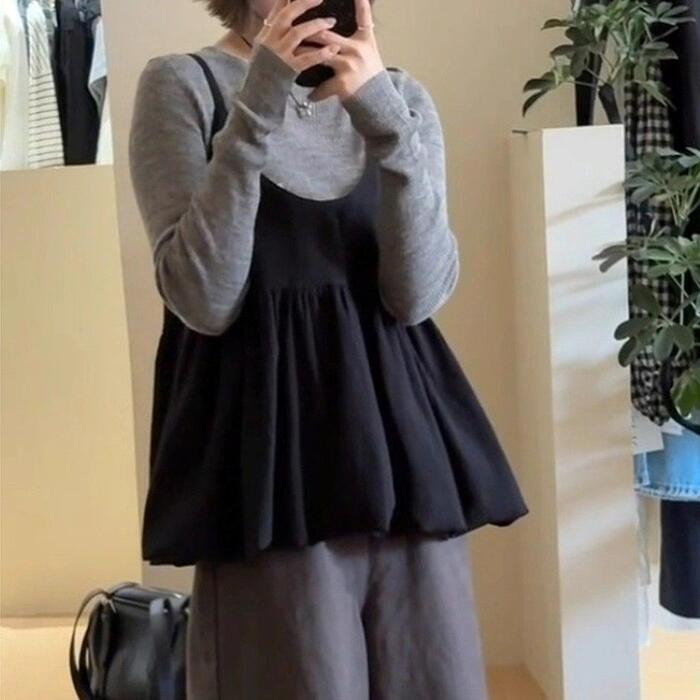 大きいサイズ 体型カバー エレガント フェミニン おしゃれ カットソー シンプル 重ね着 セットアップ アンサンブル トップス ニット キャミソール レディース きれいめ カジュアル 大人可愛い 春 秋 冬 長袖 セーター クルーネック レイヤード グレー ブラック 黒 20代 30代 40代 50代 S M L XL