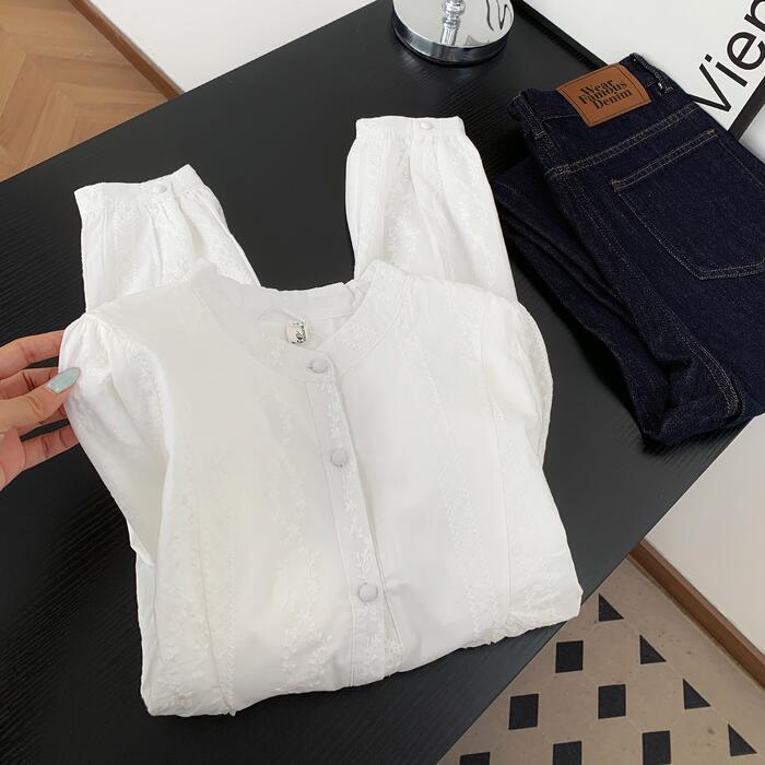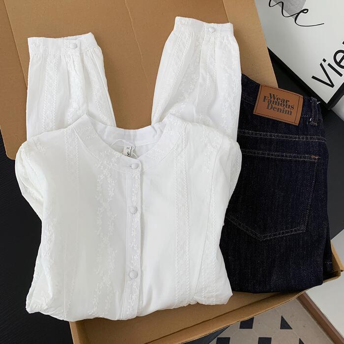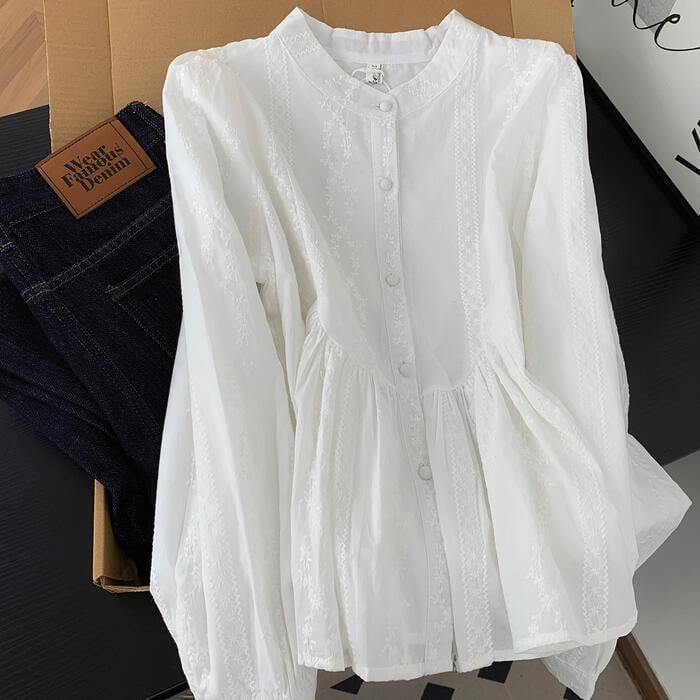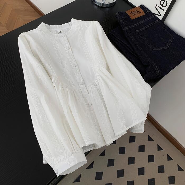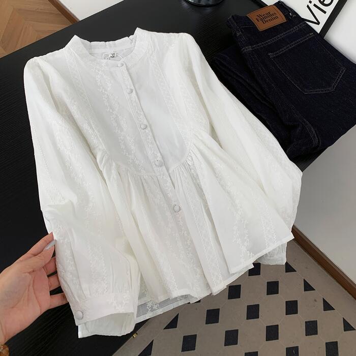 大きいサイズ 体型カバー エレガント フェミニン おしゃれ シンプル クラシカル トップス シャツ ブラウス レディース きれいめ カジュアル 大人可愛い 春 秋 冬 長袖 刺繍 フラワー バンドカラー ペプラム 切り替え ホワイト 白 20代 30代 40代 50代 M L XL