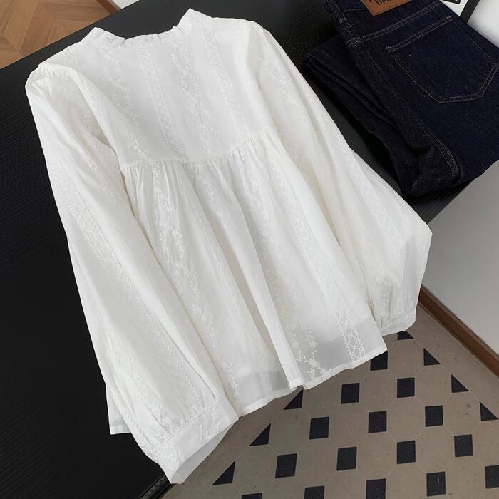 ヴィンテージライクな雰囲気が魅力の長袖刺繍ブラウス。