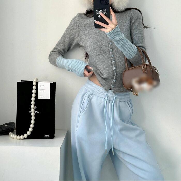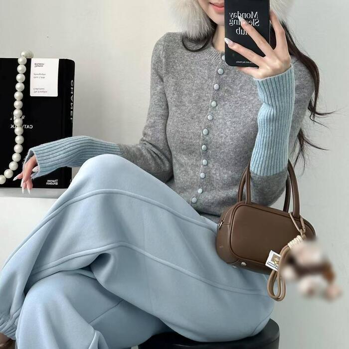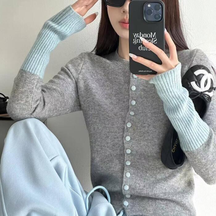 大きいサイズ 体型カバー エレガント フェミニン おしゃれ カットソー シンプル トップス ニット カーディガン レディース きれいめ カジュアル 大人可愛い 春 秋 冬 長袖 セーター 配色 バイカラー ロングリブ クルーネック グレー 20代 30代 40代 50代 S M L XL