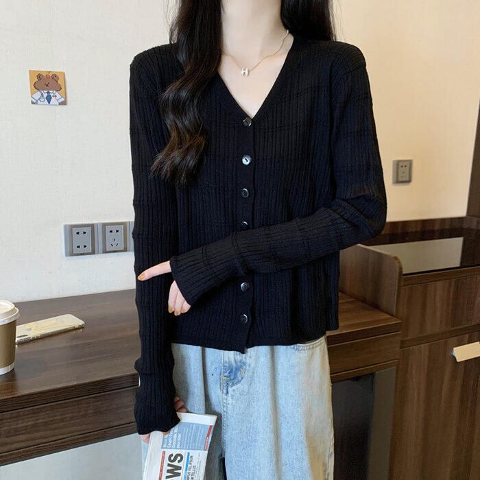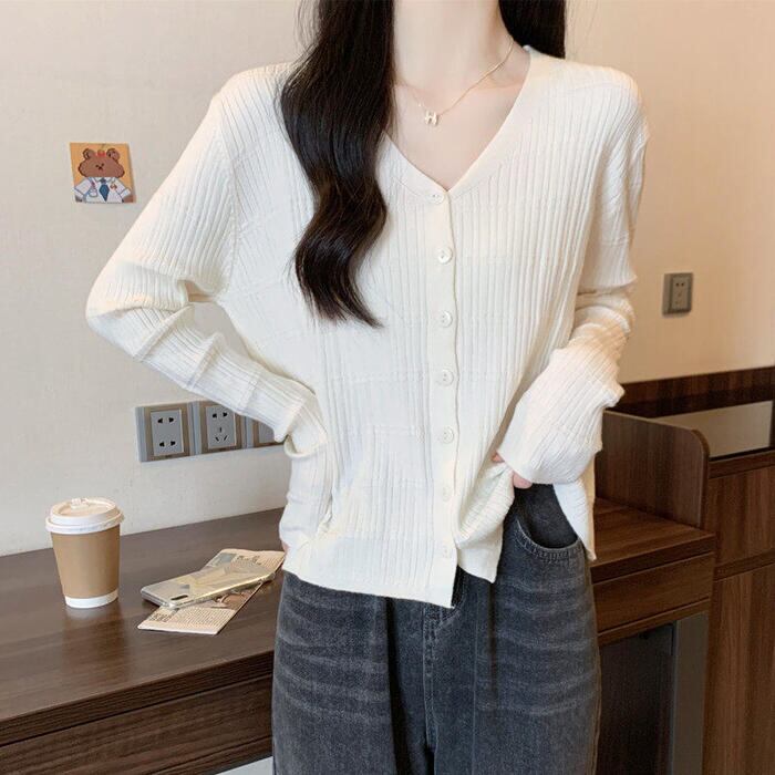 女性らしさを引き立てるVネックリブニットカーディガン。