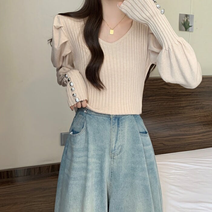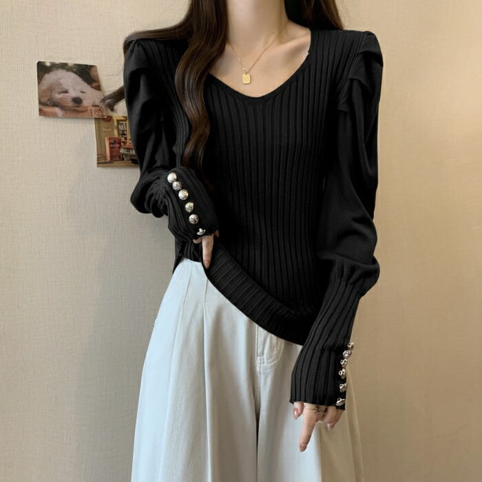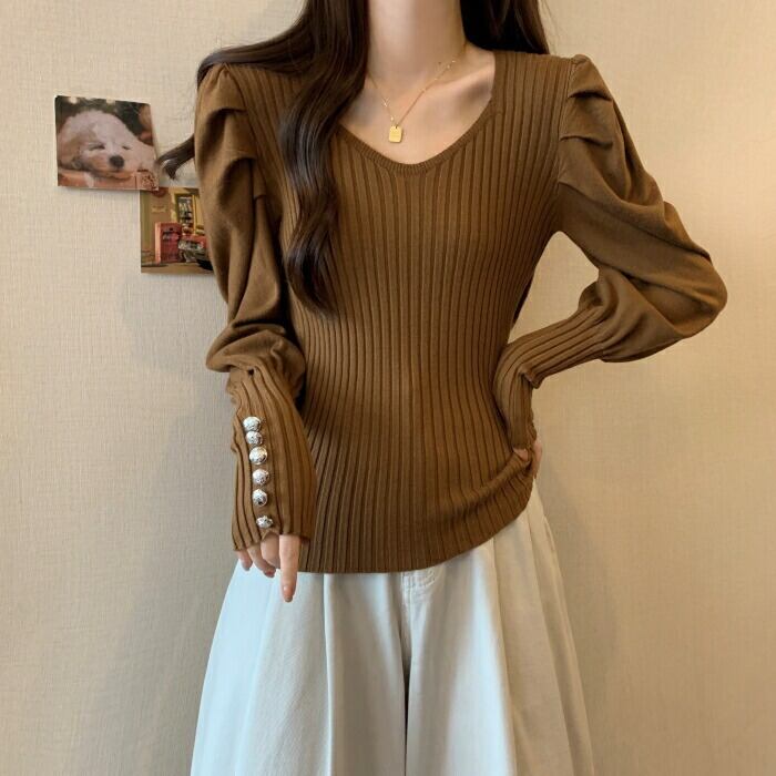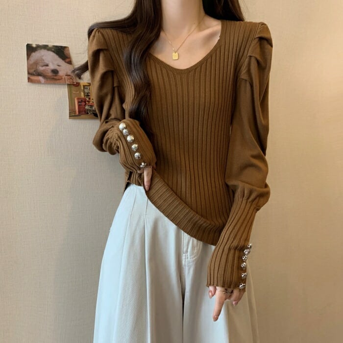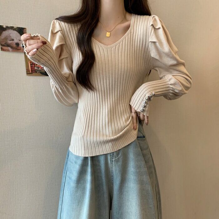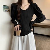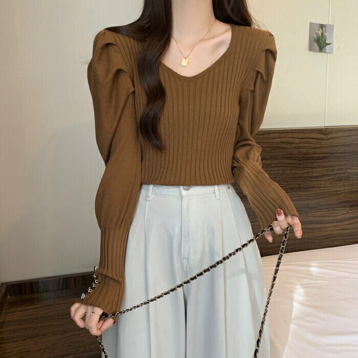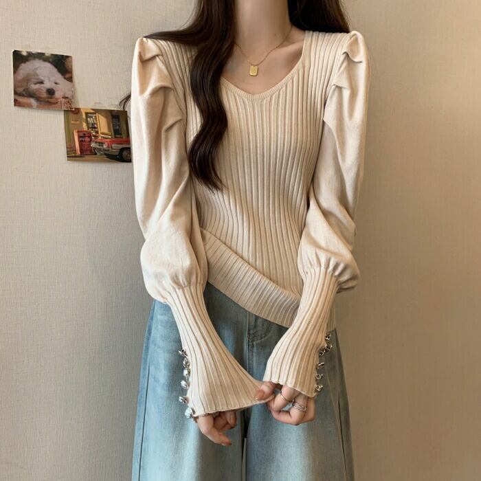 優雅なパフスリーブと繊細なリブが女性らしさを引き立てるVネックニット。