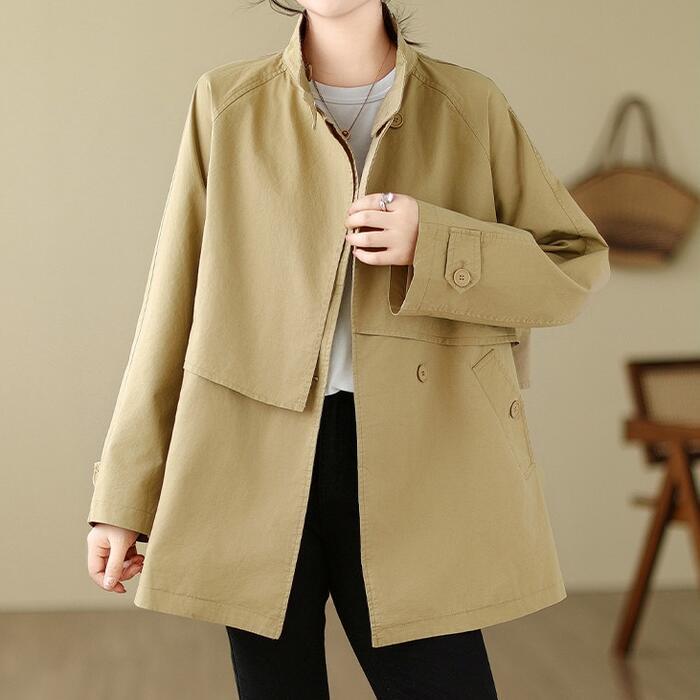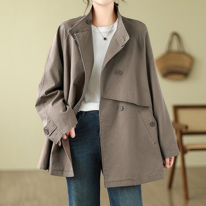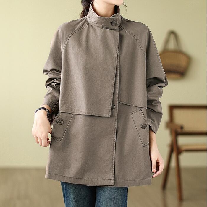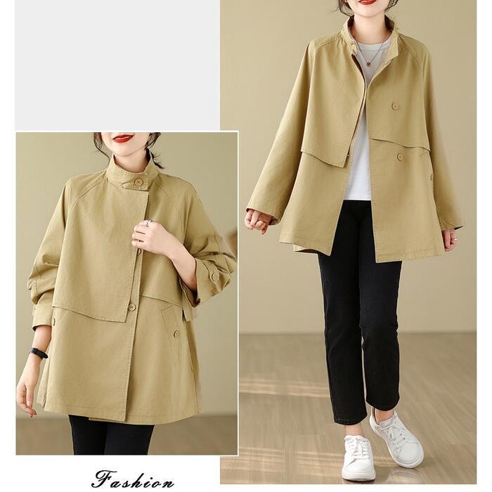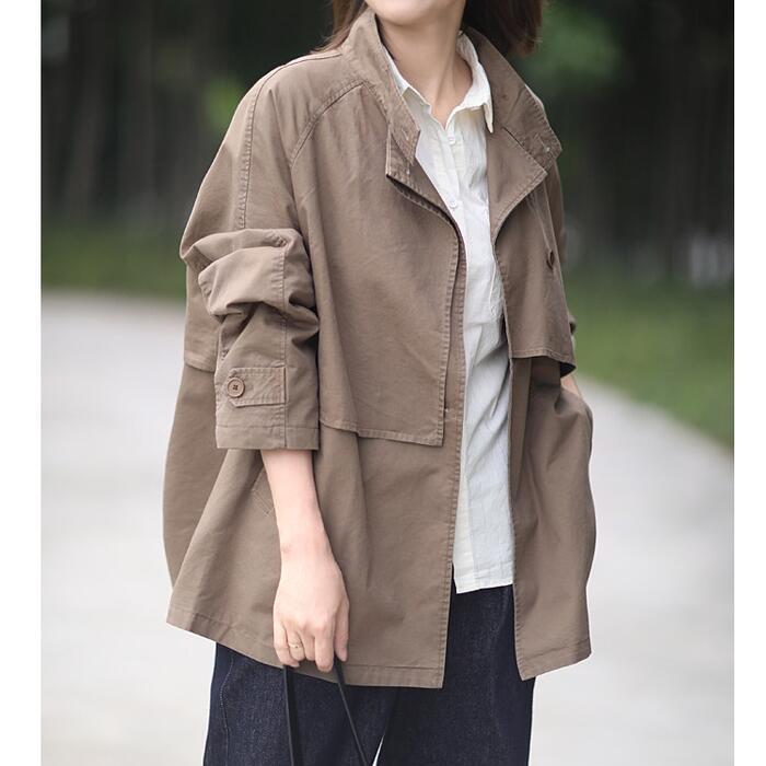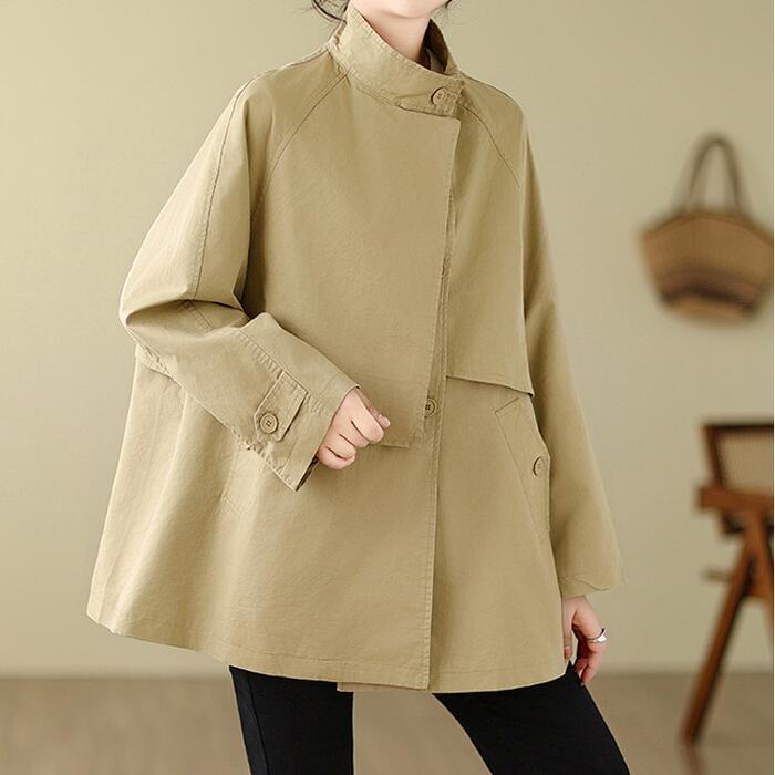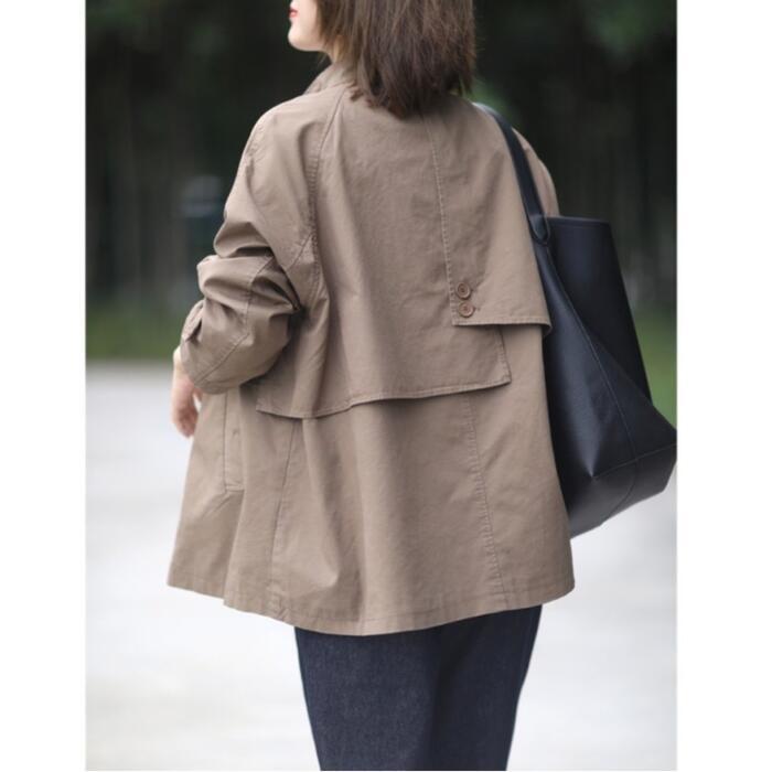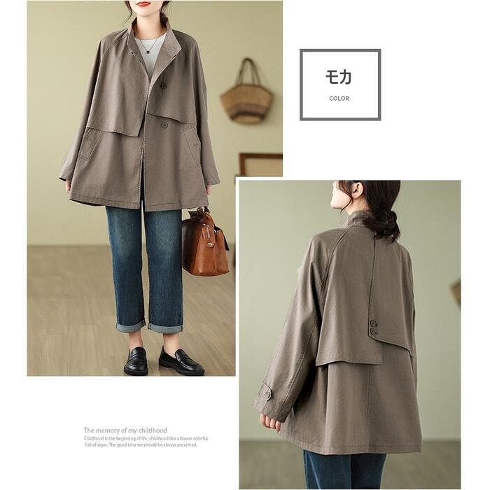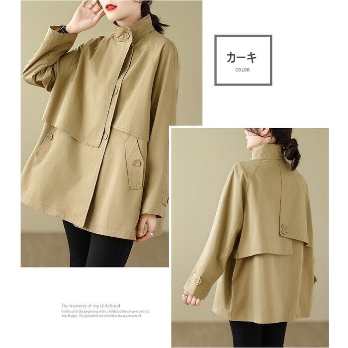 全2色 大きいサイズ 体型カバー エレガント フェミニン おしゃれ トラッド アウター コート ジャケット レディース きれいめ カジュアル 大人可愛い 春 秋 冬 トレンチ スタンドカラー ミディ丈 長袖 アシンメトリー バックシャン ベージュ ブラウン 20代 30代 40代 50代 M L XL 2XL