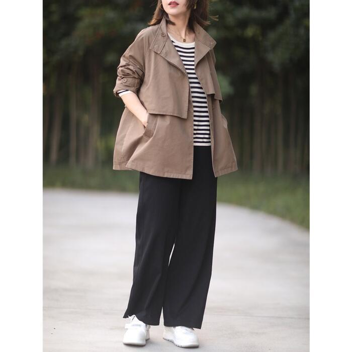 裾に向かって広がるシルエットで、「カチッ」としすぎない、大人のリラックス感を演出します。