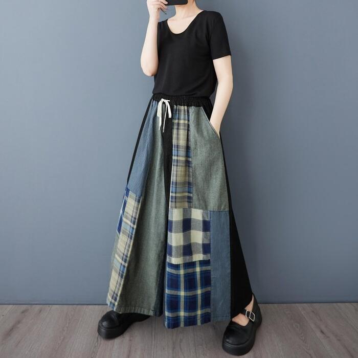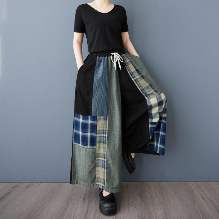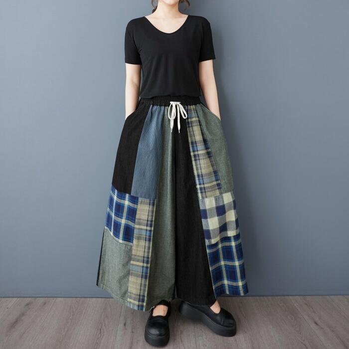 大きいサイズ 体型カバー エレガント フェミニン おしゃれ ボトムス パンツ ワイドパンツ レディース きれいめ カジュアル 大人可愛い 春 秋 冬 パッチワーク チェック デニム ロング丈 ガウチョ ウエストゴム フレア ブラック 黒 20代 30代 40代 50代 フリー