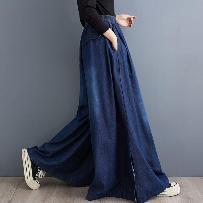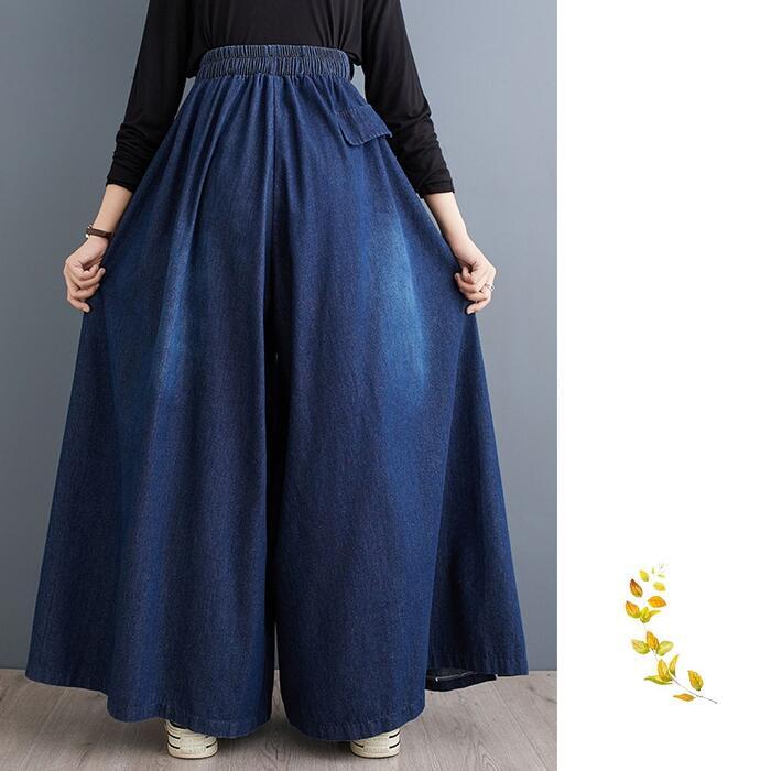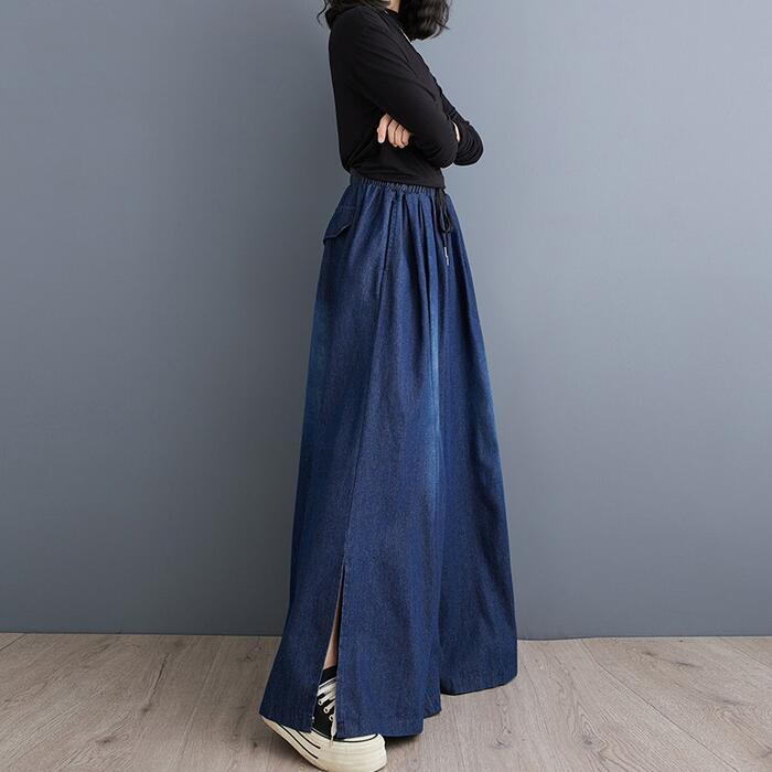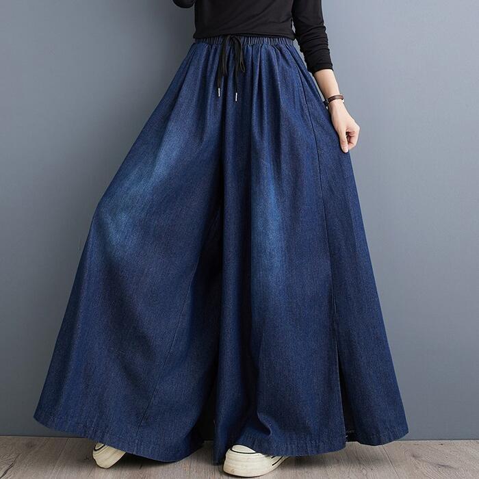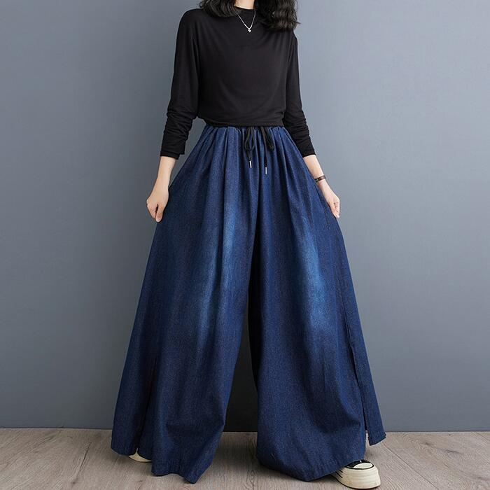 大きいサイズ 体型カバー エレガント フェミニン おしゃれ ゆったり ボトムス パンツ レディース きれいめ カジュアル 大人可愛い 春 夏 秋 冬 デニム ロング丈 ワイドパンツ ウエストゴム ガウチョ フレア スリット ブルー 青 20代 30代 40代 50代 L XL 2XL 3XL
