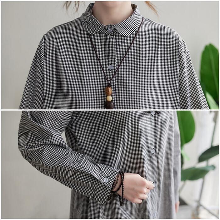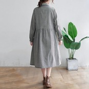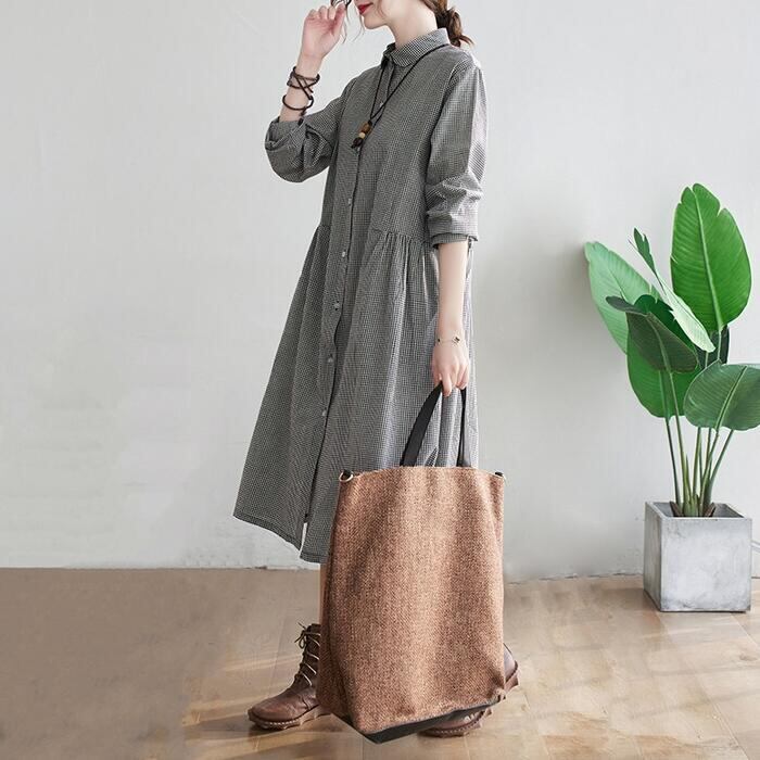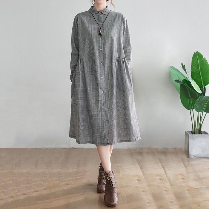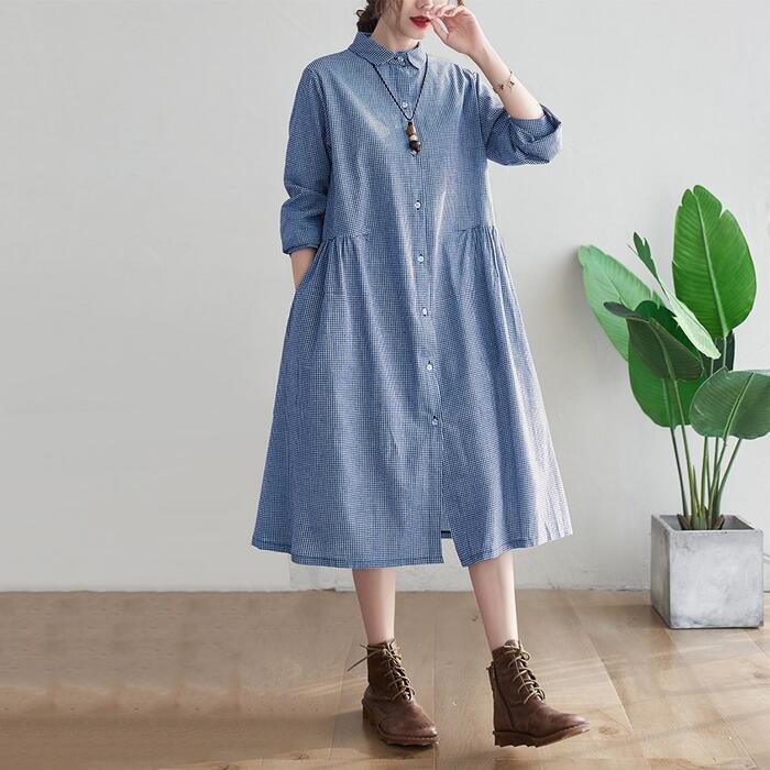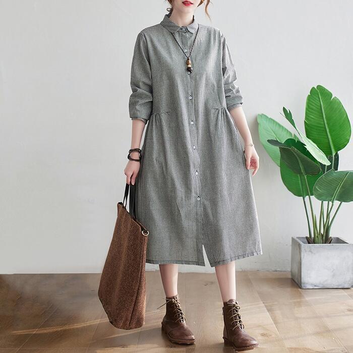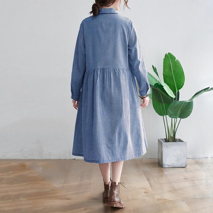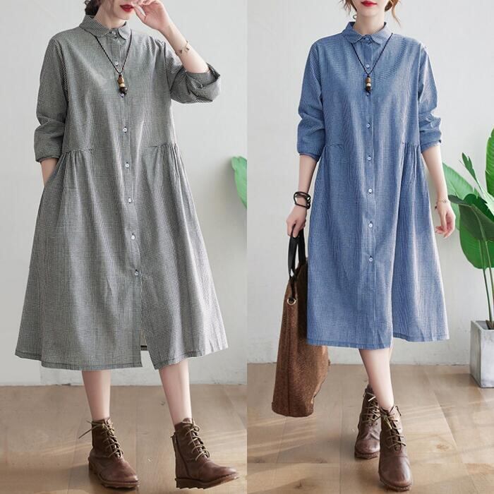 全2色 大きいサイズ 体型カバー エレガント フェミニン おしゃれ シンプル ワンピース ドレス レディース きれいめ カジュアル 大人可愛い 春 秋 冬 長袖 ギンガムチェック シャツワンピ ミモレ丈 Aライン ブルー 青 ブラック 黒 20代 30代 40代 50代 M L XL 2XL