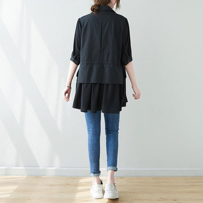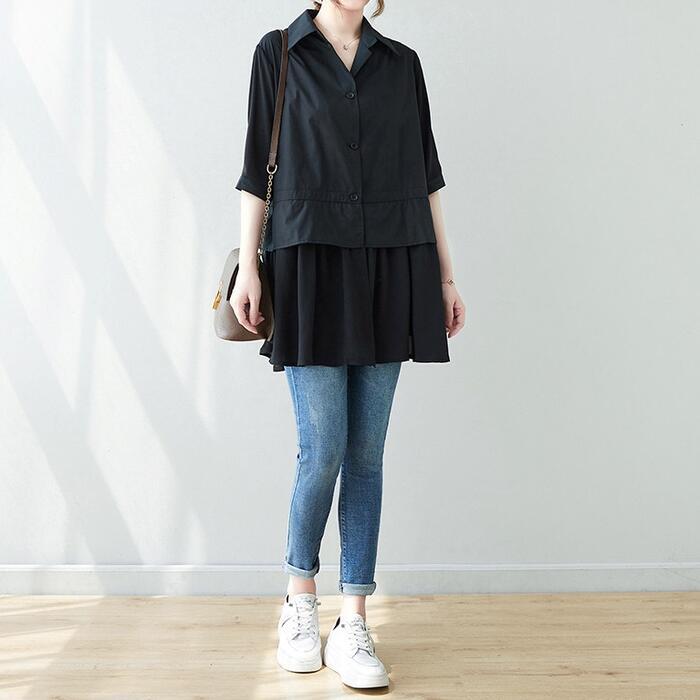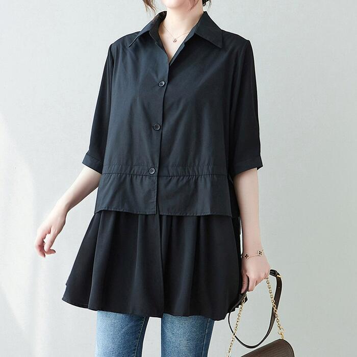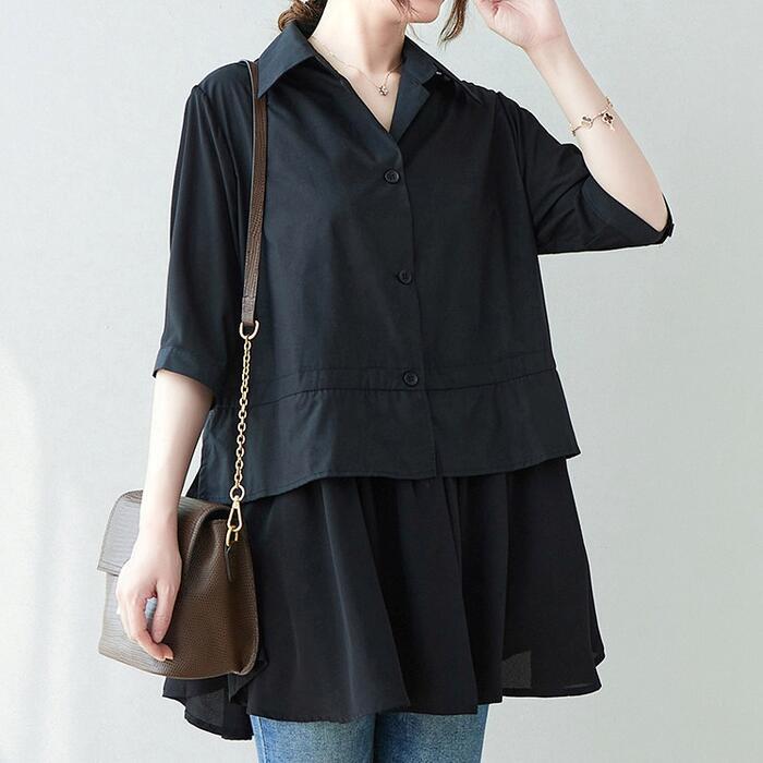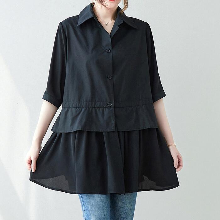 大きいサイズ 体型カバー エレガント フェミニン おしゃれ トップス シャツ ブラウス レディース きれいめ カジュアル 大人可愛い 春 秋 夏 五分袖 半袖 プルオーバー ペプラム 異素材ミックス ブラック 黒 20代 30代 40代 50代 L XL 2XL