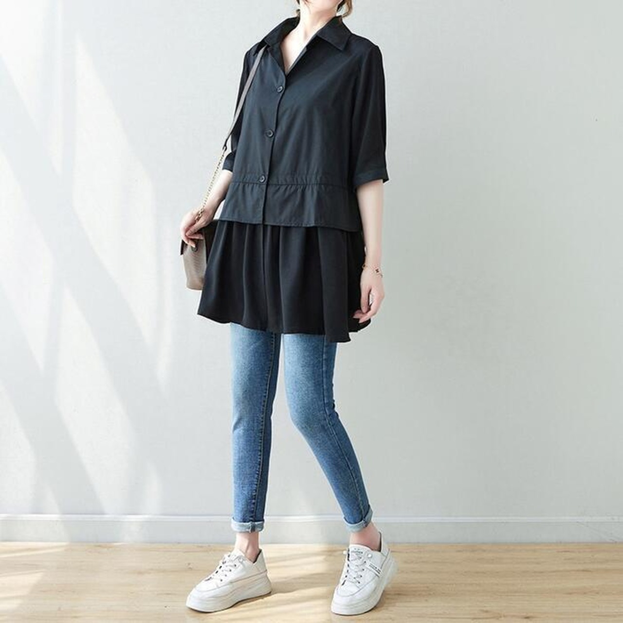 ふんわりと広がるペプラムシルエットが、気になる腰回りをカバーしてくれます。